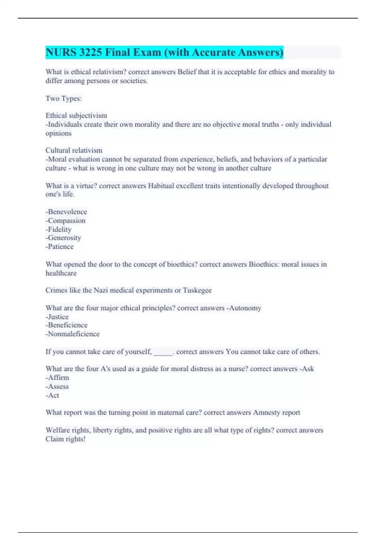 What is ethical relativism? correct answers Belief that it is acceptable for ethics and morality to differ among persons or societies. Two Types: Ethical subjectivism -Individuals create their own morality and there are no objective moral truths - only individual opinions Cultural relativism -Moral evaluation cannot be separated from experience, beliefs, and behaviors of a particular culture - what is wrong in one culture may not be wrong in another culture What is a virtue? correct answers Habitual excellent traits intentionally developed throughout one's life. -Benevolence -Compassion -Fidelity -Generosity -Patience What opened the door to the concept of bioethics? correct answers Bioethics: moral issues in healthcare Crimes like the Nazi medical experiments or Tuskegee What are the four major ethical principles? correct answers -Autonomy -Justice -Beneficience -Nonmaleficience If you cannot take care of yourself, _____. correct answers You cannot take care of others. What are the four A's used as a guide for moral distress as a nurse? correct answers -Ask -Affirm -Assess -Act What report was the turning point in maternal care? correct answers Amnesty report Welfare rights, liberty rights, and positive rights are all what type of rights? correct answers Claim rights!