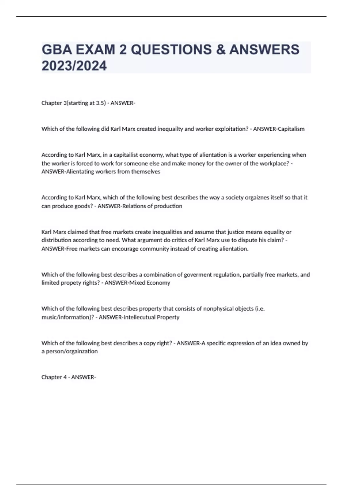 GBA EXAM 2 QUESTIONS & ANSWERS 2023/2024 Chapter 3(starting at 3.5) - ANSWER- Which of the following did Karl Marx created inequailty and worker exploitation? - ANSWER-Capitalism According to Karl Marx, in a capitailist economy, what type of alientation is a worker experiencing when the worker is forced to work for someone else and make money for the owner of the workplace? - ANSWER-Alientating workers from themselves According to Karl Marx, which of the following best describes the way a society orgaiznes itself so that it can produce goods? - ANSWER-Relations of production Karl Marx claimed that free markets create inequalities and assume that justice means equality or distribution according to need. What argument do critics of Karl Marx use to dispute his claim? - ANSWER-Free markets can encourage community instead of creating alientation. Which of the following best describes a combination of goverment regulation, partially free markets, and limited propety rights? - ANSWER-Mixed Economy Which of the following best describes property that consists of nonphysical objects (i.e. music/information)? - ANSWER-Intellecutual Property Which of the following best describes a copy right? - ANSWER-A specific expression of an idea owned by a person/orgainzation Chapter 4 - ANSWER-