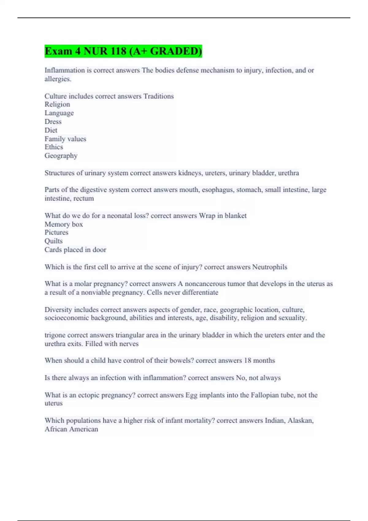 Inflammation is correct answers The bodies defense mechanism to injury, infection, and or allergies. Culture includes correct answers Traditions Religion Language Dress Diet Family values Ethics Geography Structures of urinary system correct answers kidneys, ureters, urinary bladder, urethra Parts of the digestive system correct answers mouth, esophagus, stomach, small intestine, large intestine, rectum What do we do for a neonatal loss? correct answers Wrap in blanket Memory box Pictures Quilts Cards placed in door Which is the first cell to arrive at the scene of injury? correct answers Neutrophils What is a molar pregnancy? correct answers A noncancerous tumor that develops in the uterus as a result of a nonviable pregnancy. Cells never differentiate Diversity includes correct answers aspects of gender, race, geographic location, culture, socioeconomic background, abilities and interests, age, disability, religion and sexuality. trigone correct answers triangular area in the urinary bladder in which the ureters enter and the urethra exits. Filled with nerves When should a child have control of their bowels? correct answers 18 months Is there always an infection with inflammation? correct answers No, not always What is an ectopic pregnancy? correct answers Egg implants into the Fallopian tube, not the uterus Which populations have a higher risk of infant mortality? correct answers Indian, Alaskan, African American