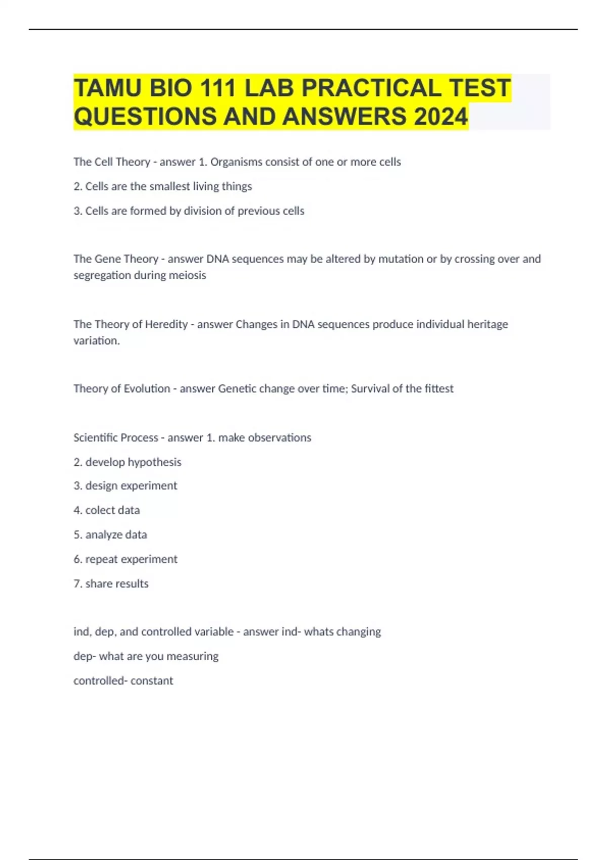 TAMU BIO 111 LAB PRACTICAL TEST QUESTIONS AND ANSWERS 2024