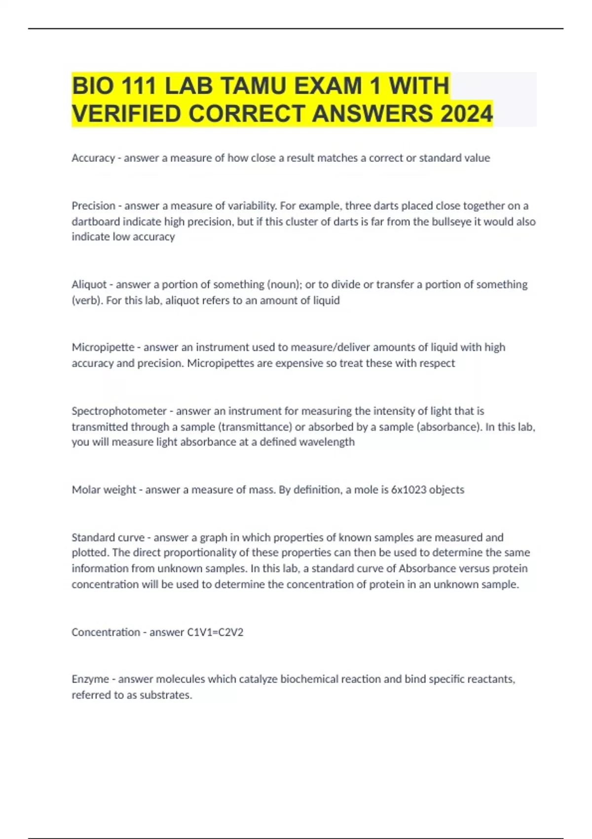 BIO 111 LAB TAMU EXAM 1 WITH VERIFIED CORRECT ANSWERS 2024