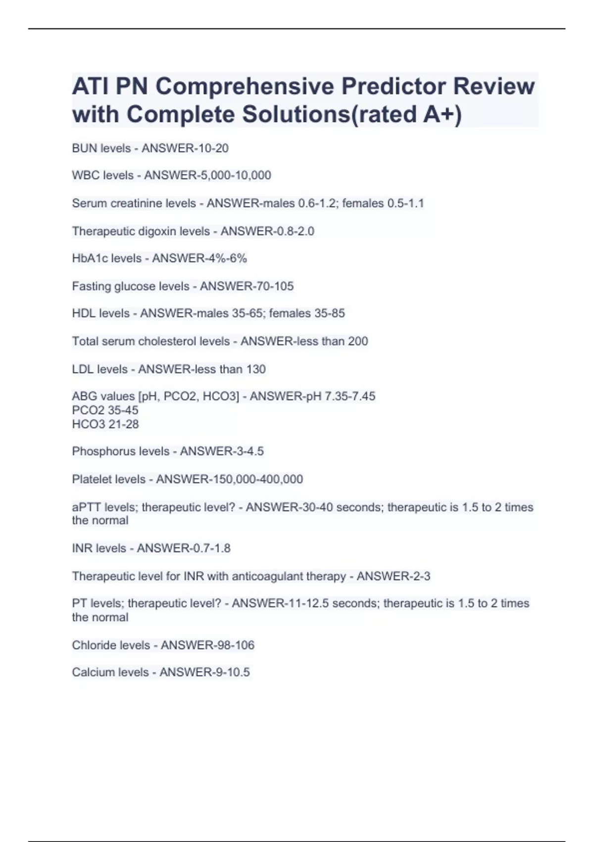 ATI PN Comprehensive Predictor Review with Complete Solutions(rated A+)BUN levels - ANSWER-10-20 WBC levels - ANSWER-5,000-10,000 Serum creatinine levels - ANSWER-males 0.6-1.2; females 0.5-1.1 Therapeutic digoxin levels - ANSWER-0.8-2.0 HbA1c levels - ANSWER-4%-6% Fasting glucose levels - ANSWER-70-105 HDL levels - ANSWER-males 35-65; females 35-85 Total serum cholesterol levels - ANSWER-less than 200 LDL levels - ANSWER-less than 130 ABG values [pH, PCO2, HCO3] - ANSWER-pH 7.35-7.45 PCO2 35-45 HCO3 21-28
