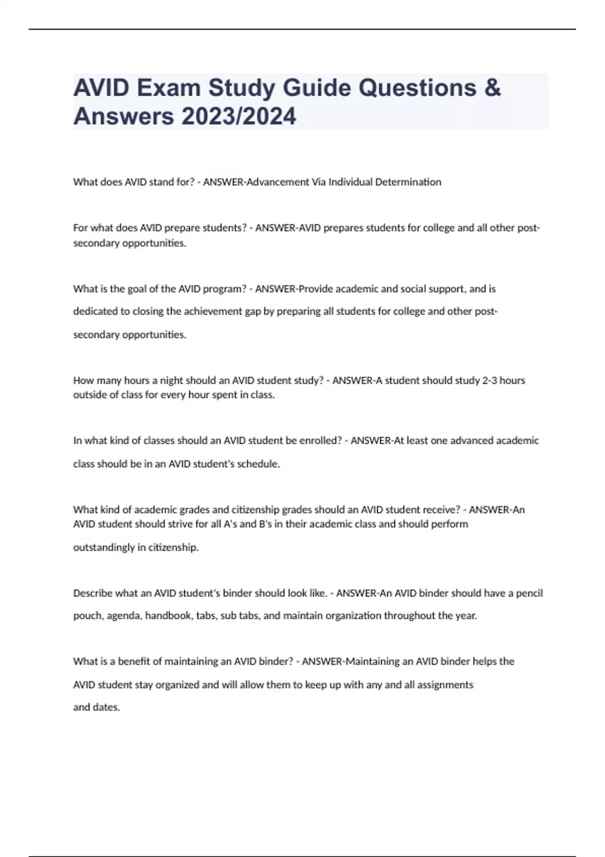 AVID Exam Study Guide Questions & Answers 2023/2024 What does AVID stand for? - ANSWER-Advancement Via Individual Determination For what does AVID prepare students? - ANSWER-AVID prepares students for college and all other post-secondary opportunities. What is the goal of the AVID program? - ANSWER-Provide academic and social support, and is dedicated to closing the achievement gap by preparing all students for college and other post- secondary opportunities. How many hours a night should an AVID student study? - ANSWER-A student should study 2-3 hours outside of class for every hour spent in class. In what kind of classes should an AVID student be enrolled? - ANSWER-At least one advanced academic class should be in an AVID student's schedule. What kind of academic grades and citizenship grades should an AVID student receive? - ANSWER-An AVID student should strive for all A's and B's in their academic class and should perform outstandingly in citizenship. Describe what an AVID student's binder should look like. - ANSWER-An AVID binder should have a pencil pouch, agenda, handbook, tabs, sub tabs, and maintain organization throughout the year. What is a benefit of maintaining an AVID binder? - ANSWER-Maintaining an AVID binder helps the AVID student stay organized and will allow them to keep up with any and all assignments and dates.