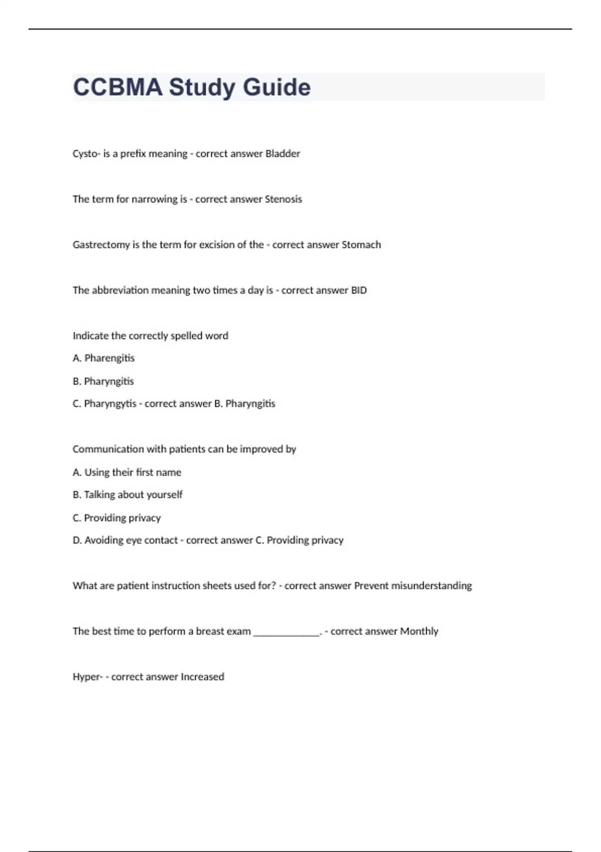 CCBMA Study Guide Question and answers 2023/2024 verified to pass Cysto- is a prefix meaning - correct answer Bladder The term for narrowing is - correct answer Stenosis Gastrectomy is the term for excision of the - correct answer Stomach The abbreviation meaning two times a day is - correct answer BID Indicate the correctly spelled word A. Pharengitis B. Pharyngitis C. Pharyngytis - correct answer B. Pharyngitis Communication with patients can be improved by A. Using their first name B. Talking about yourself C. Providing privacy D. Avoiding eye cont