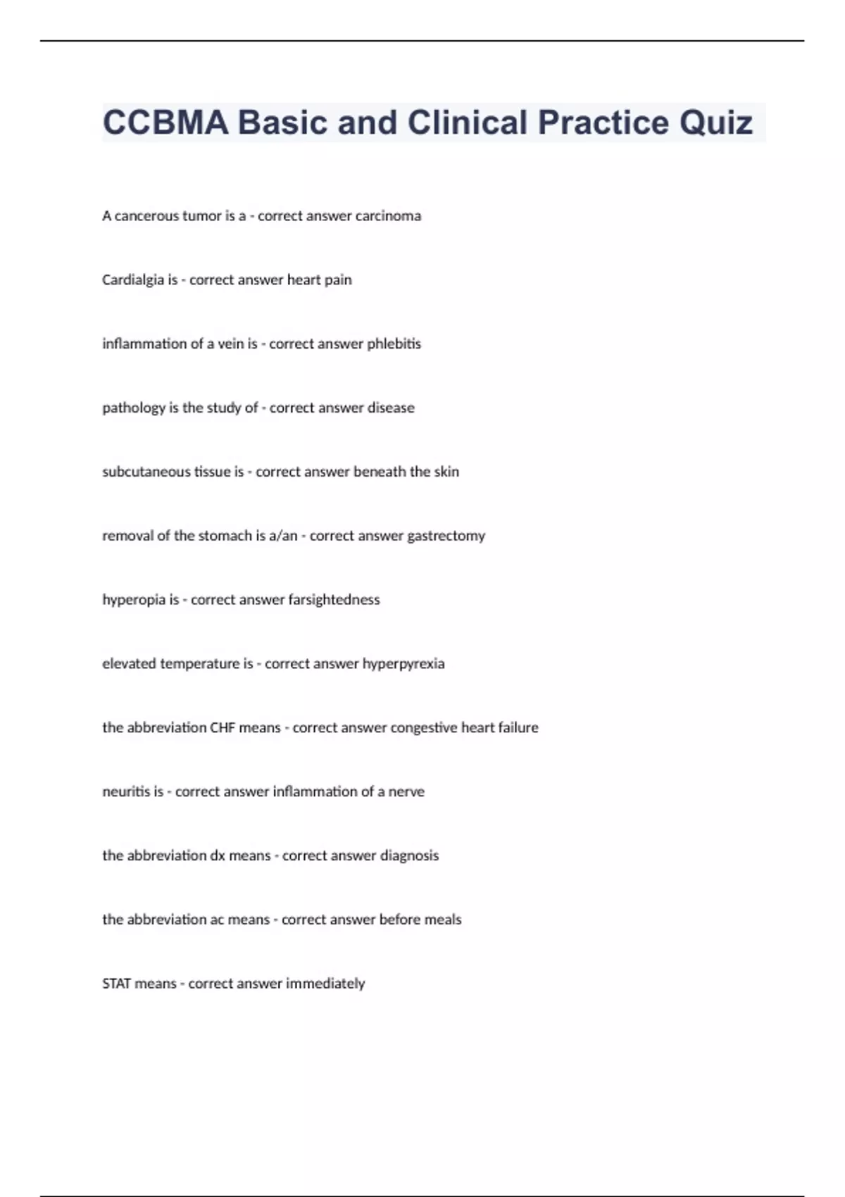 CCBMA Basic and Clinical Practice Quiz Question and answers 2023/2024 verified to pass A cancerous tumor is a - correct answer carcinoma Cardialgia is - correct answer heart pain inflammation of a vein is - correct answer phlebitis pathology is the study of - correct answer disease subcutaneous tissue is - correct answer beneath the skin removal of the stomach is a/an - correct answer gastrectomy hyperopia is - correct answer farsightedness