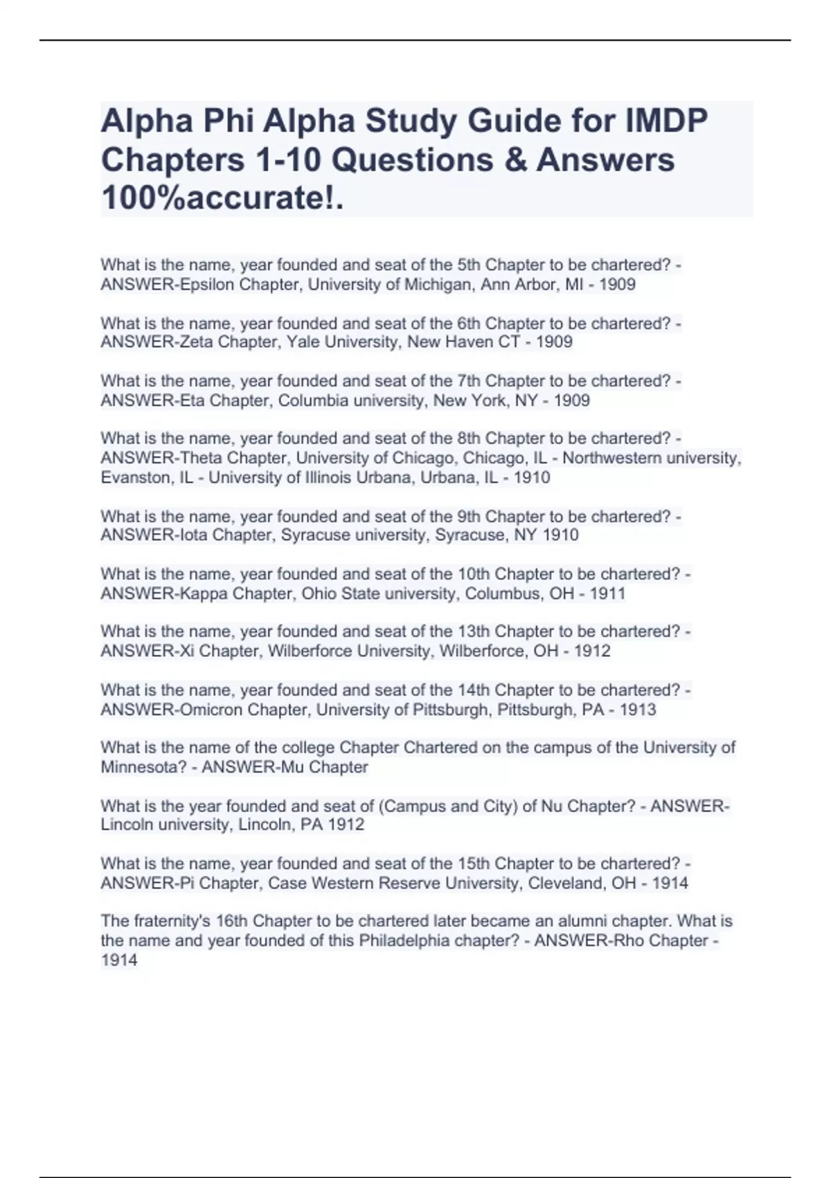 Alpha Phi Alpha Study Guide for IMDP Chapters 1-10 Questions & Answers 100%accurate!. What is the name, year founded and seat of the 5th Chapter to be chartered? - ANSWER-Epsilon Chapter, University of Michigan, Ann Arbor, MI - 1909 What is the name, year founded and seat of the 6th Chapter to be chartered? - ANSWER-Zeta Chapter, Yale University, New Haven CT - 1909 What is the name, year founded and seat of the 7th Chapter to be chartered? - ANSWER-Eta Chapter, Columbia university, New York, NY - 1909 What is the name, year founded and seat of the 8th Chapter to be chartered? - ANSWER-Theta Chapter, University of Chicago, Chicago, IL - Northwestern university, Evanston, IL - University of Illinois Urbana, Urbana, IL - 1910 What is the name, year founded and seat of the 9th Chapter to be chartered? - ANSWER-Iota Chapter, Syracuse university, Syracuse, NY 1910 What is the name, year founded and seat of the 10th Chapter to be chartered? - ANSWER-Kappa Chapter, Ohio State university, Columbus, OH - 1911 What is the name, year founded and seat of the 13th Chapter to be chartered? - ANSWER-Xi Chapter, Wilberforce University, Wilberforce, OH - 1912 What is the name, year founded and seat of the 14th Chapter to be chartered? - ANSWER-Omicron Chapter, University of Pittsburgh, Pittsburgh, PA - 1913 What is the name of the college Chapter Chartered on the campus of the University of Minnesota? - ANSWER-Mu Chapter What is the year founded and seat of (Campus and City) of Nu Chapter? - ANSWER-