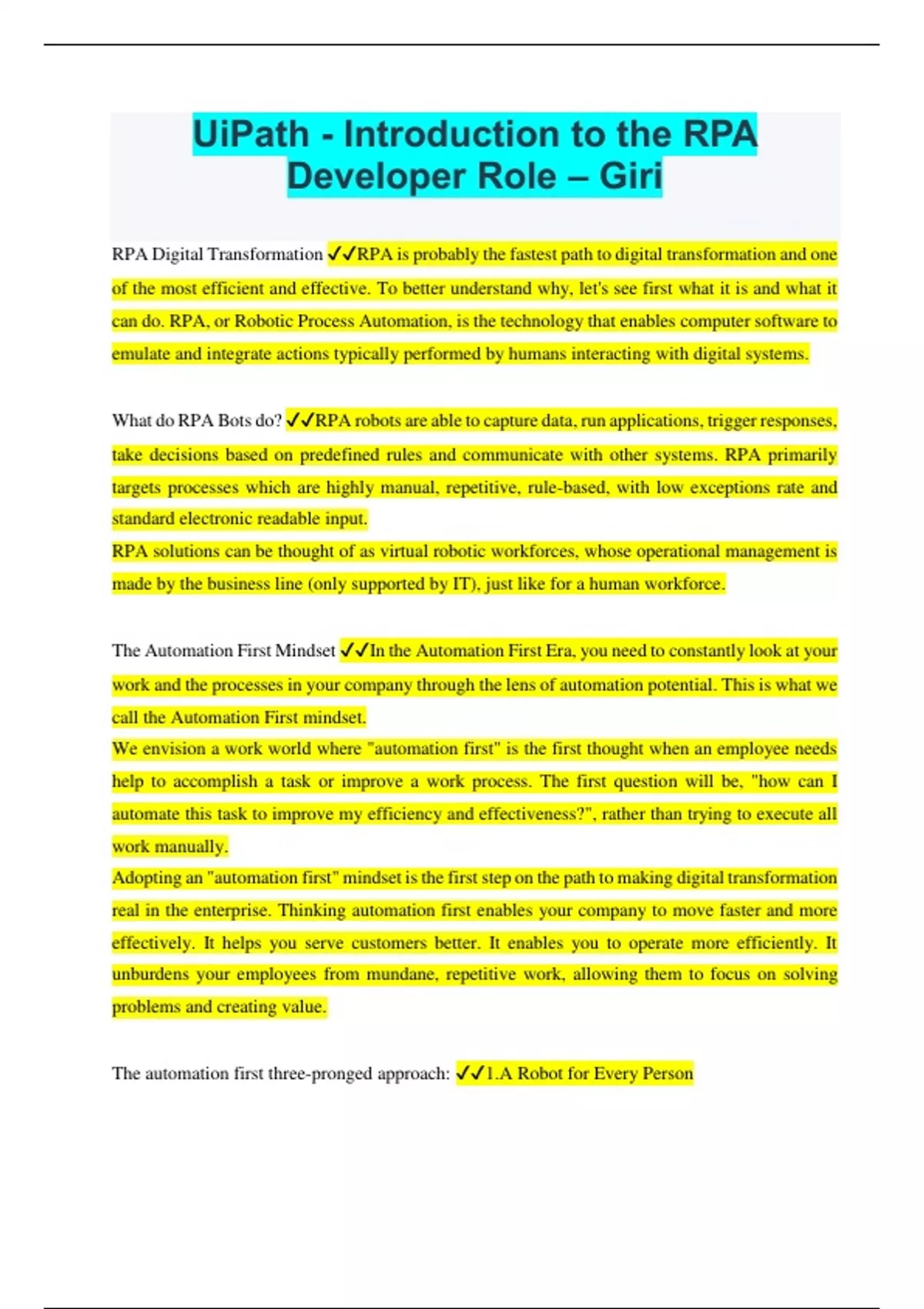 UiPath - Introduction to the RPA Developer Role – Giri RPA Digital Transformation RPA is probably the fastest path to digital transformation and one of the most efficient and effective. To better understand why, let's see first what it is and what it can do. RPA, or Robotic Process Automation, is the technology that enables computer software to emulate and integrate actions typically performed by humans interacting with digital systems. What do RPA Bots do? RPA robots are able to capture data, run applications, trigger responses, take decisions based on predefined rules and communicate with other systems. RPA primarily targets processes which are highly manual, repetitive, rule-based, with low exceptions rate and standard electronic readable input. RPA solutions can be thought of as virtual robotic workforces, whose operational management is made by the business line (only supported by IT), just like for a human workforce. The Automation First Mindset In the Automation First Era, you need to constantly look at your work and the processes in your company through the lens of automation potential. This is what we call the Automation First mindset. We envision a work world where "automation first" is the first thought when an employee needs help to accomplish a task or improve a work process. The first question will be, "how can I automate this task to improve my efficiency and effectiveness?", rather than trying to execute all work manually. Adopting an "automation first" mindset is the first step on the path to making digital transformation real in the enterprise. Thinking automation first enables your company to move faster and more effectively. It helps you serve customers better. It enables you to operate more efficiently. It unburdens your employees from mundane, repetitive work, allowing them to focus on solving problems and creating value. The automation first three-pronged approach: 1.A Robot for Every Person
