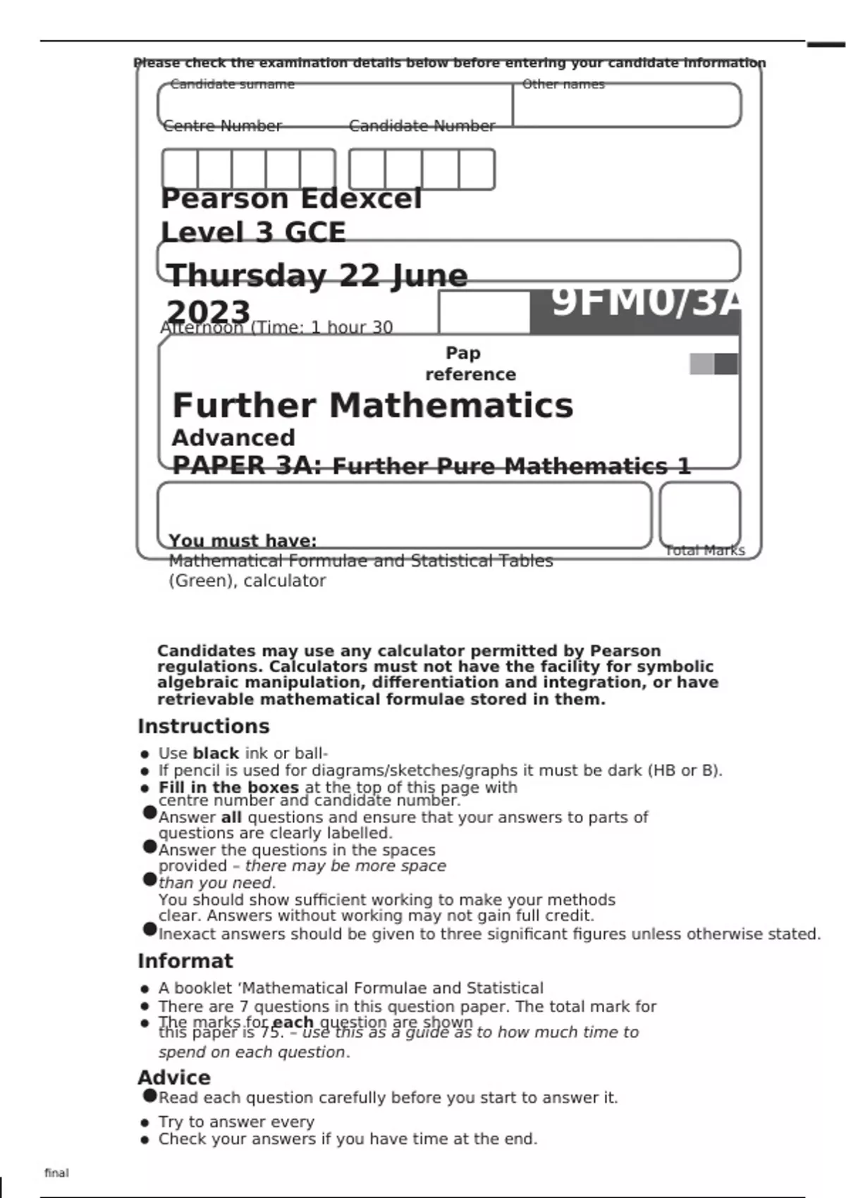 Edexcel A Level Further Mathematics 9FM0/3A Question Paper June2023.