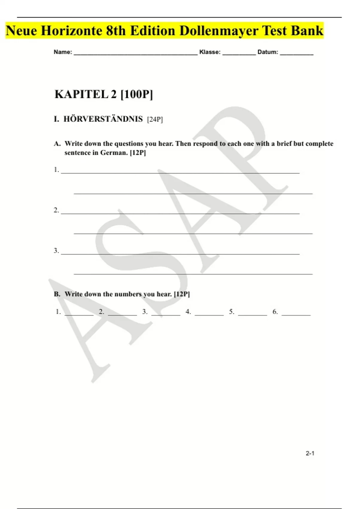 Neue Horizonte 8th Edition Dollenmayer Test Bank 2-1 Name: _____________________________________ Klasse: __________ Datum: __________ KAPITEL 2 [100P] I. HÖRVERSTÄNDNIS [24P] A. Write down the questions you hear. Then respond to each one with a brief but complete sentence in German. [12P] 1. __________________________________________________________________ __________________________________________________________________ 2. __________________________________________________________________ __________________________________________________________________ 3. __________________________________________________________________ __________________________________________________________________ B. Write down the numbers you hear. [12P] 1. ________ 2. ________ 3. ________ 4. ________ 5. ________ 6.
