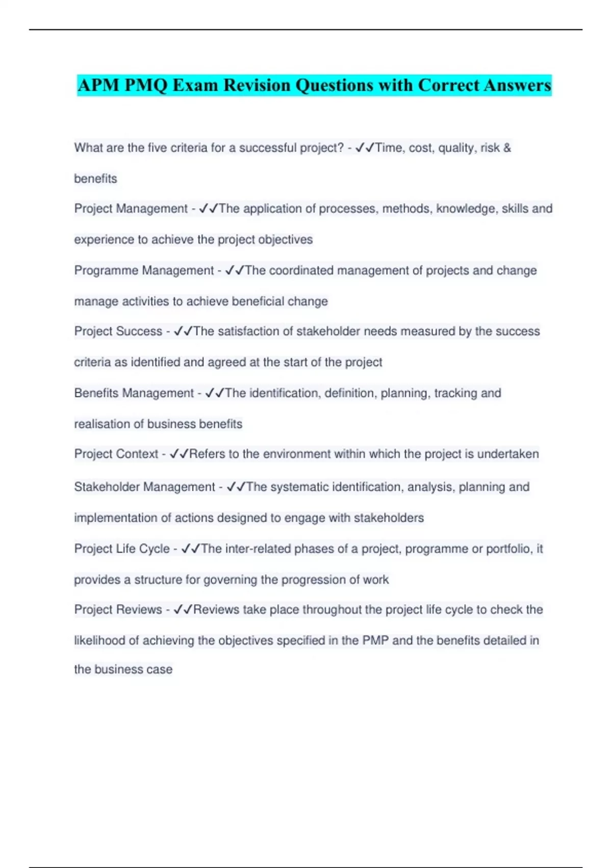 APM PMQ Exam Revision Questions with Correct Answers What are the five criteria for a successful project? - ️️ Time, cost, quality, risk & benefits Project Management - ️️ The application of processes, methods, knowledge, skills and experience to achieve the project objectives Programme Management - ️️ The coordinated management of projects and change manage activities to achieve beneficial change Project Success - ️️ The satisfaction of stakeholder needs measured by the success criteria as identified and agreed at the start of the project Benefits Management - ️️ The identification, definition, planning, tracking and realisation of business benefits Project Context - ️️ Refers to the environment within which the project is undertaken Stakeholder Management - ️️ The systematic identification, analysis, planning and implementation of actions designed to engage with stakeholders Project Life Cycle - ️️ The inter-related phases of a project, programme or portfolio, it provides a structure for governing the progression of work Project Reviews - ️️ Reviews take place throughout the project life cycle to check the likelihood of achieving the objectives specified in the PMP and the benefits detailed in the business case