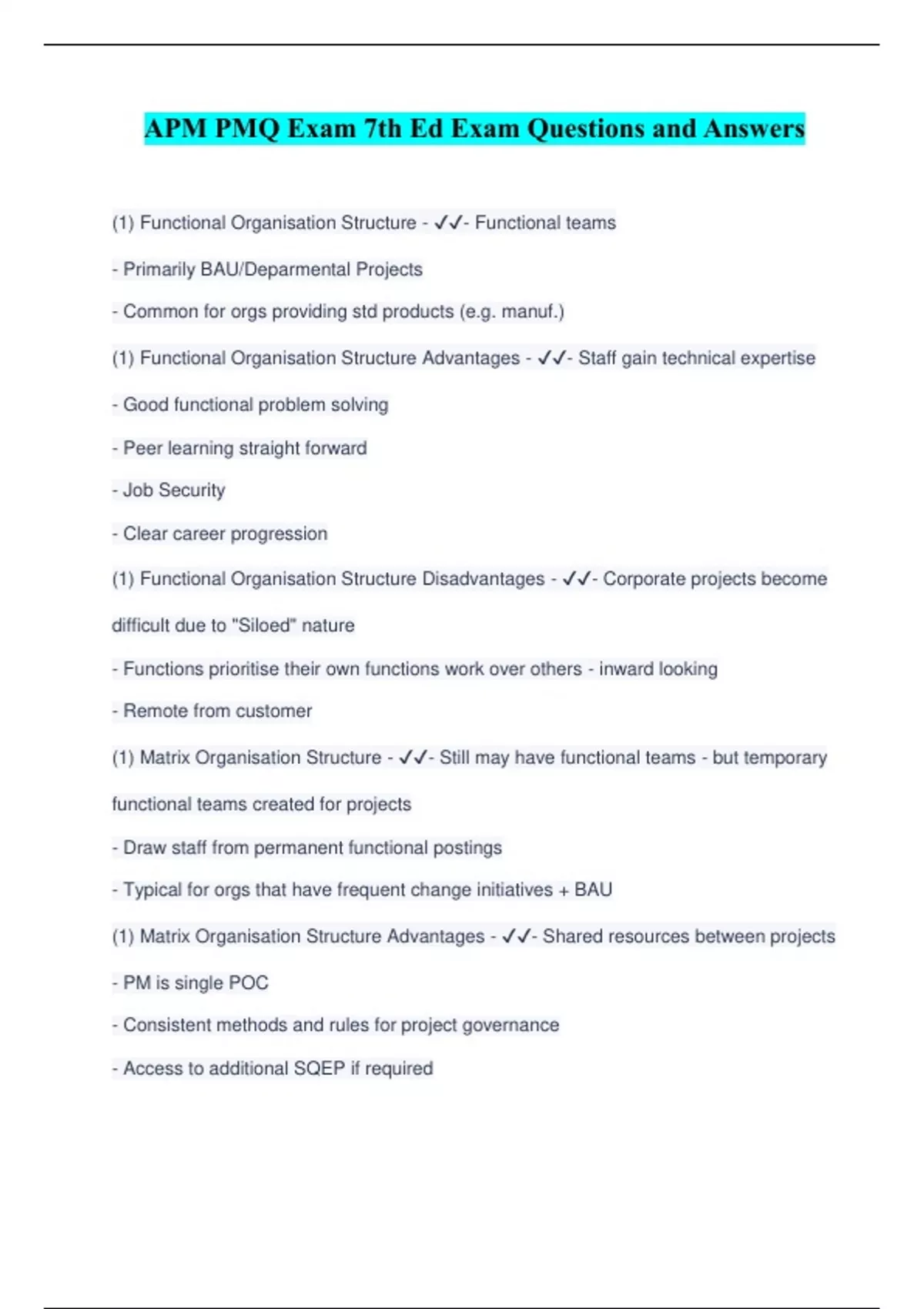 APM PMQ Exam 7th Ed Exam Questions and Answers (1) Functional Organisation Structure - ️️ - Functional teams - Primarily BAU/Deparmental Projects - Common for orgs providing std products (e.g. manuf.) (1) Functional Organisation Structure Advantages - ️️ - Staff gain technical expertise - Good functional problem solving - Peer learning straight forward - Job Security - Clear career progression (1) Functional Organisation Structure Disadvantages - ️️ - Corporate projects become difficult due to "Siloed" nature - Functions prioritise their own functions work over others - inward looking - Remote from customer (1) Matrix Organisation Structure - ️️ - Still may have functional teams - but temporary functional teams created for projects - Draw staff from permanent functional postings - Typical for orgs that have frequent change initiatives + BAU (1) Matrix Organisation Structure Advantages - ️️ - Shared resources between projects - PM is single POC - Consistent methods and rules for project governance - Access to additional SQEP if req
