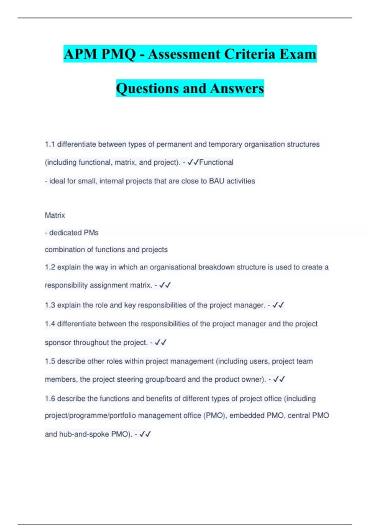 APM PMQ - Assessment Criteria Exam Questions and Answers 1.1 differentiate between types of permanent and temporary organisation structures (including functional, matrix, and project). - ️️ Functional - ideal for small, internal projects that are close to BAU activities Matrix - dedicated PMs combination of functions and projects 1.2 explain the way in which an organisational breakdown structure is used to create a responsibility assignment matrix. - ️️ 1.3 explain the role and key responsibilities of the project manager. - ️️ 1.4 differentiate between the responsibilities of the project manager and the project sponsor throughout the project. - ️️ 1.5 describe other roles within project management (including users, project team members, the project steering group/board and the product owner). - ️️ 1.6 describe the functions and benefits of different types of project office (including project/programme/portfolio management office (PMO), embedded PMO, central PMO and hub-and-spoke PMO