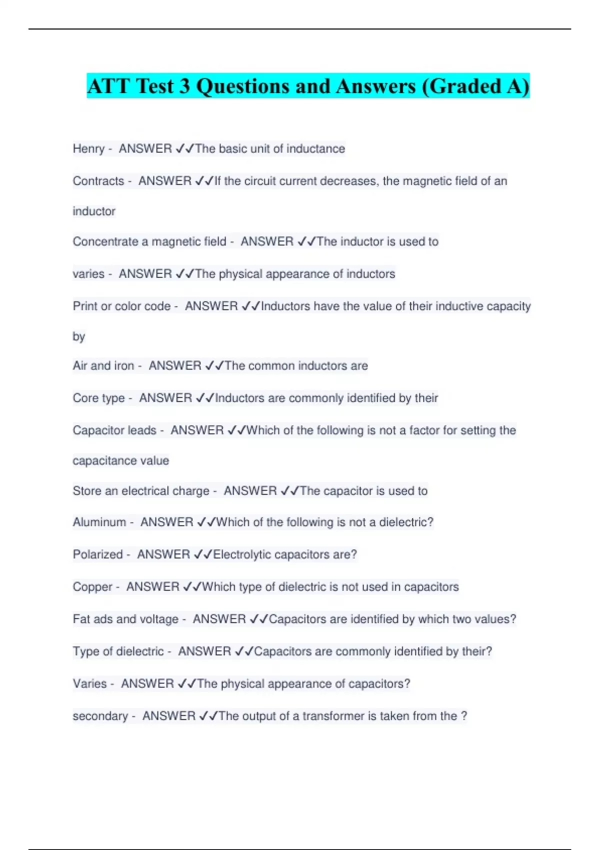 ATT Test 3 Questions and Answers (Graded A) Henry - ANSWER ️️ The basic unit of inductance Contracts - ANSWER ️️ If the circuit current decreases, the magnetic field of an inductor Concentrate a magnetic field - ANSWER ️️ The inductor is used to varies - ANSWER ️️ The physical appearance of inductors Print or color code - ANSWER ️️ Inductors have the value of their inductive capacity by Air and iron - ANSWER ️️ The common inductors are Core type - ANSWER ️️ Inductors are commonly identified by their Capacitor leads - ANSWER ️️ Which of the following is not a factor for setting the capacitance value Store an electrical charge - ANSWER ️️ The capacitor is used to Aluminum - ANSWER ️️ Which of the following is not a dielectric? Polarized - ANSWER ️️ Electrolytic capacitors are? Copper - ANSWER ️️ Which type of dielectric is not used in capacitors Fat ads and voltage - ANSWER ️️ Capacitors are identified by which two values? Type of dielectric - ANSWER ️️ Capacitors are commonly identified by their? Varies - ANSWER ️️ The physical appearance of capacitors? secondary - ANSWER ️️ The output of a transformer is