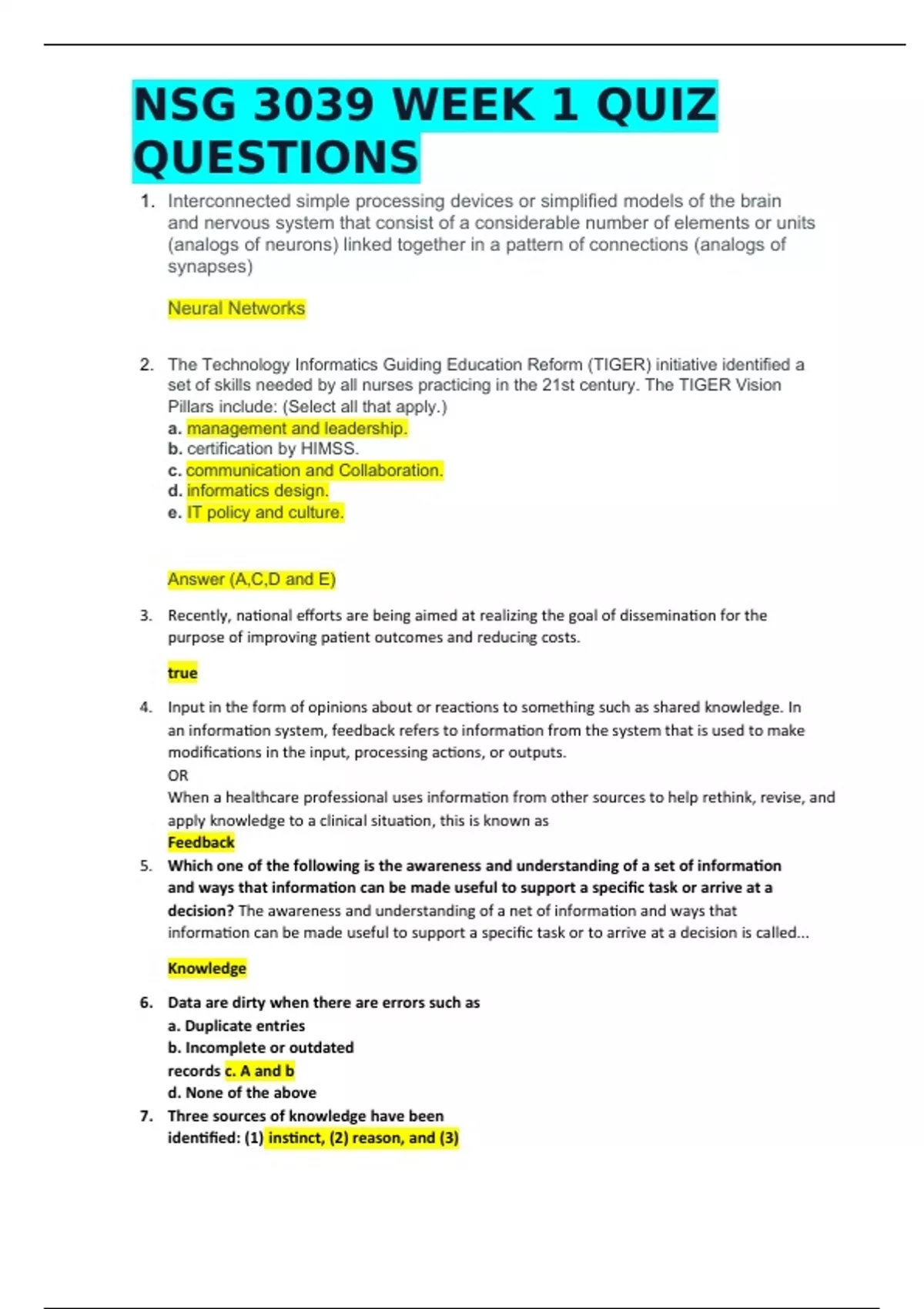 NSG 3039 WEEK 1 QUIZ QUESTIONS 1. Interconnected simple processing devices or simplified models of the brain and nervous system that consist of a considerable number of elements or units (analogs of neurons) linked together in a pattern of connections (analogs of synapses) Neural Networks 2. The Technology Informatics Guiding Education Reform (TIGER) initiative identified a set of skills needed by all nurses practicing in the 21st century. The TIGER Vision Pillars include: (Select all that apply.) a. management and leadership