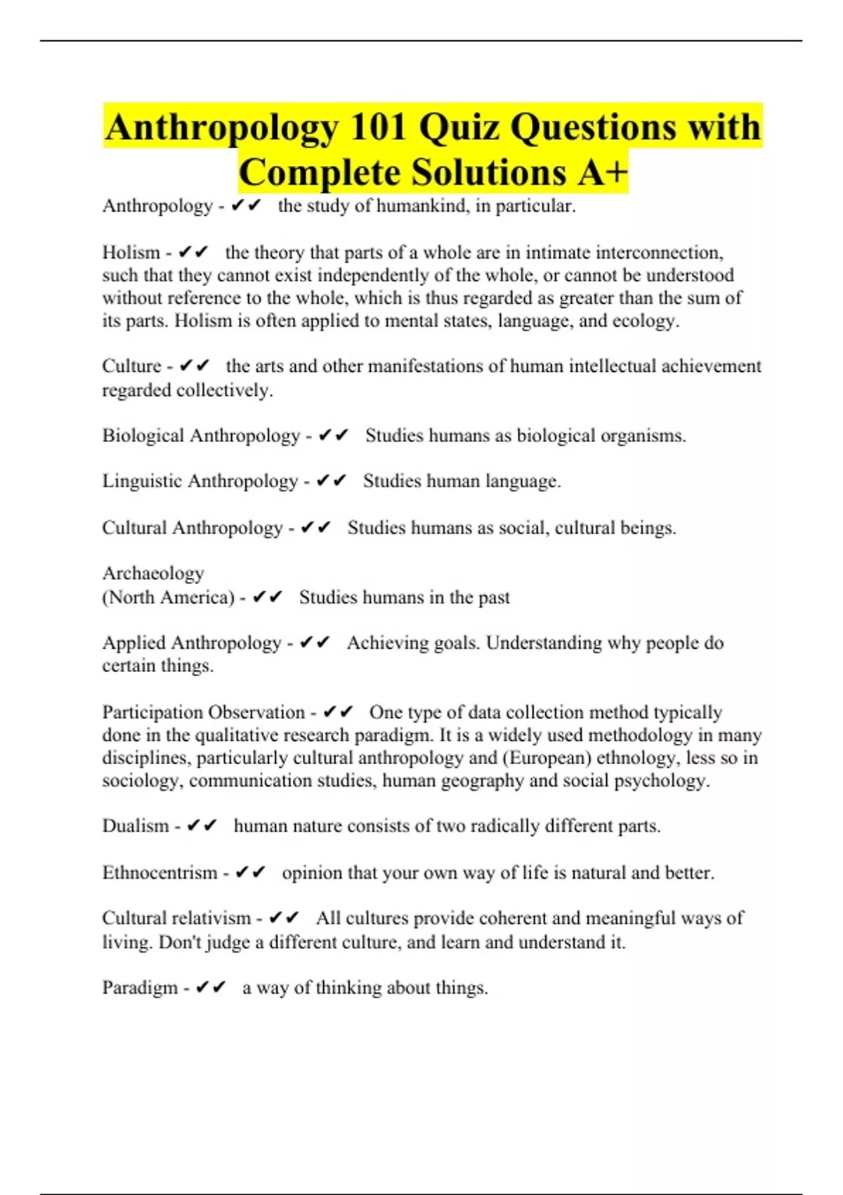 Anthropology 101 Quiz Questions with Complete Solutions A+