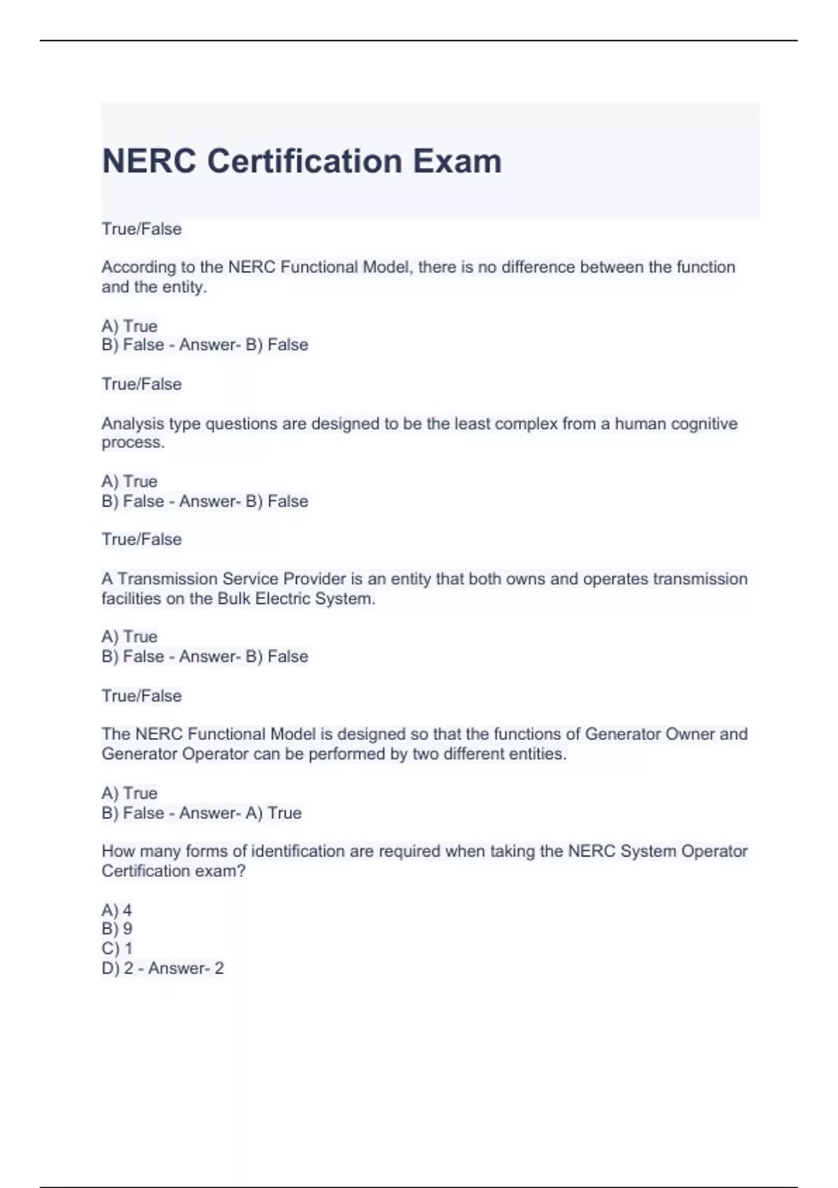 NERC Certification Exam Questions and Answers