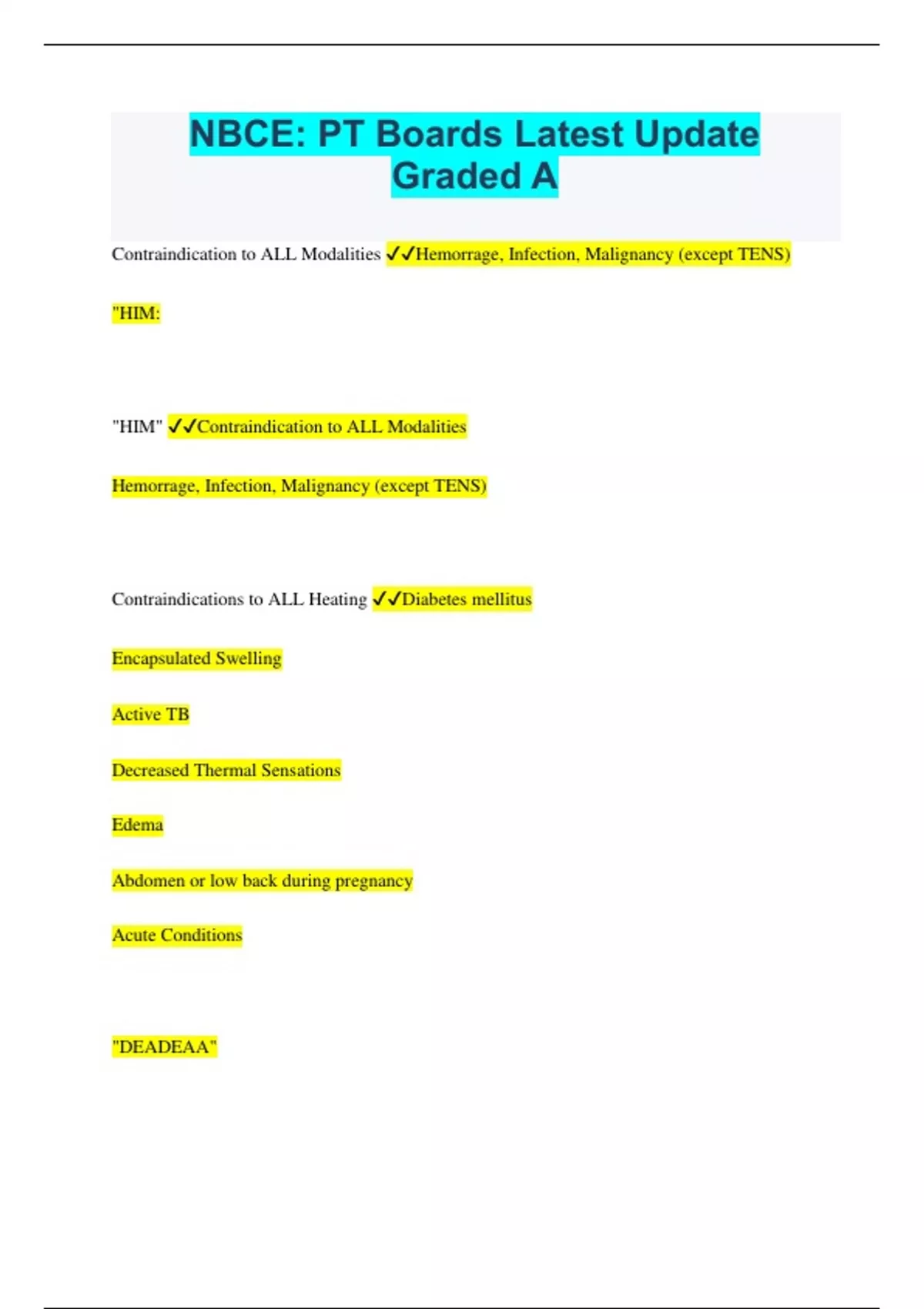 NBCE: PT Boards Latest Update Graded A Contraindication to ALL Modalities Hemorrage, Infection, Malignancy (except TENS) "HIM: "HIM" Contraindication to ALL Modalities Hemorrage, Infection, Malignancy (except TENS) Contraindications to ALL Heating Diabetes mellitus Encapsulated Swelling Active TB Decreased Thermal Sensations Edema Abdomen or low back during pregnancy Acute Conditions "DEADEAA" Diabetes mellitus Encapsulated Swelling Active TB Decreased Thermal Sensations Edema Abdomen or low back during pregnancy Acute Conditions Contraindications to ALL Heating Define Acute: Up to 72 hours Define Subacute: 72 hours or early phases of disease. Swelling is limited, but debris and discoloration prevents healing. Contrast Therapy Ice then Heat then Ice then Heat. This creates a pumping affect. Good for Peripheral Vascular Disease and also in the SUBacute phase of healing. Define Chronic: Lasting 2 weeks longer then anticipated Contraindications to all Electrical Therapy. Brain Eyes Heart Carotid Sinus Pacemaker Anesthesia (except High Volt) Pregnancy Low Back (Except TENS) Open Wounds Treatment of Acute Conditions Protect Rest Ice Compression Elevate Support What is the Hertz of Ultra Low < 1