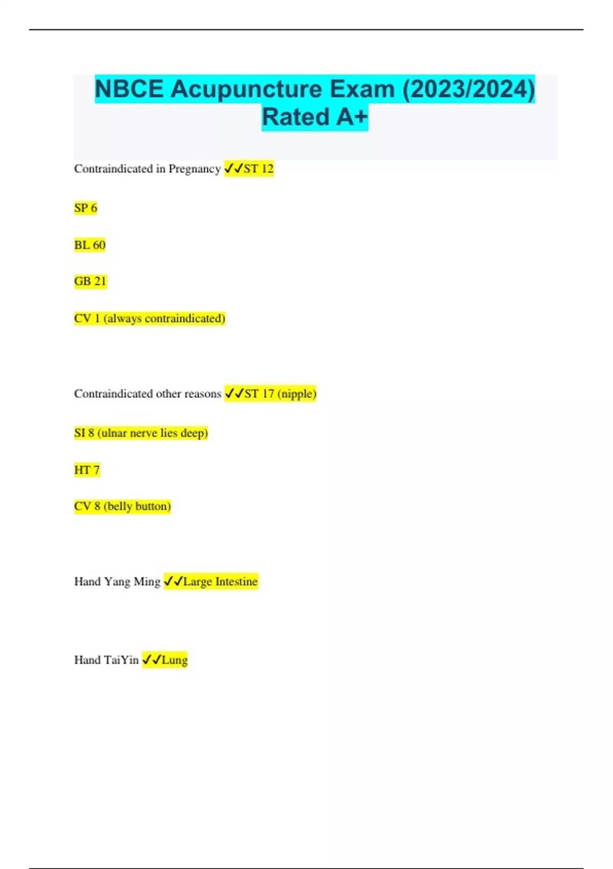 NBCE Acupuncture Exam (2023/2024) Rated A+ Contraindicated in Pregnancy ST 12 SP 6 BL 60 GB 21 CV 1 (always contraindicated) Contraindicated other reasons ST 17 (nipple) SI 8 (ulnar nerve lies deep) HT 7 CV 8 (belly button) Hand Yang Ming Large Intestine Hand TaiYin Lung Foot Yang Ming Stomach Foot Tai Yin Spleen Hand Shao Yin Heart Hand Tai Yang Small Intestine Foot Tai Yang Bladder Foot Shao Yin Kidney Hand Jueyin Pericardium Hand Shao Yang San Jiao Foot Shao Yang Gall Bladder Foot Jueyin Liver Yin/Zang Organs Lung Spleen Heart Kidney Pericardium Liver Yang/Fu Organs Large Intestine Stomach Small Intestine Bladder San Jiao Gall Bladder Entry Point LU LU 1 Exit Point LU LU 7 Entry & Exit Point LI LI 4 LI 20 Entry & Exit Point ST ST1 ST 42 Entry & Exit Point SP SP 1 SP 21 Entry & Exit Point Ht HT 1 HT 9 Entry & Exit Point SI SI 1 SI 19 Entry & Exit Point UB UB 1 UB 67 Entry & Exit Point KI KI 1 KI 22 Entry & Exit Point P P 1 P 8 Entry & Exit Point SJ SJ 1 SJ 22 Entry & Exit Point GB GB 1 GB 41 Entry & Exit Point LV LV 1 LV 14 4 command points Abdomen ST 36 Head & Back of neck LU 7 Back (upper and lower) UB 40 Face and Mouth LI 4 Lower He Sea Points Stomach - ST 36 Large Intestine - ST 37 Small Intestine - ST 39 Gall Bladder - GB - 34 Urinary Bladder - UB 40 San Jiao - UB 39 3 Jiao Upper Middle Lower Upper - Ren 17 Middle - Ren 12 Lower - Ren 7 Horary Points Lung - LU 8 Spleen - 3 Heart - 8 Kidney - 10 Pericardium - 8 Liver - 1 Large Intestine - 1 Stomach - 36 Small Intestine - 5 Urinary Bladder - 66 San Jiao - 6 Gall Bladder - 41