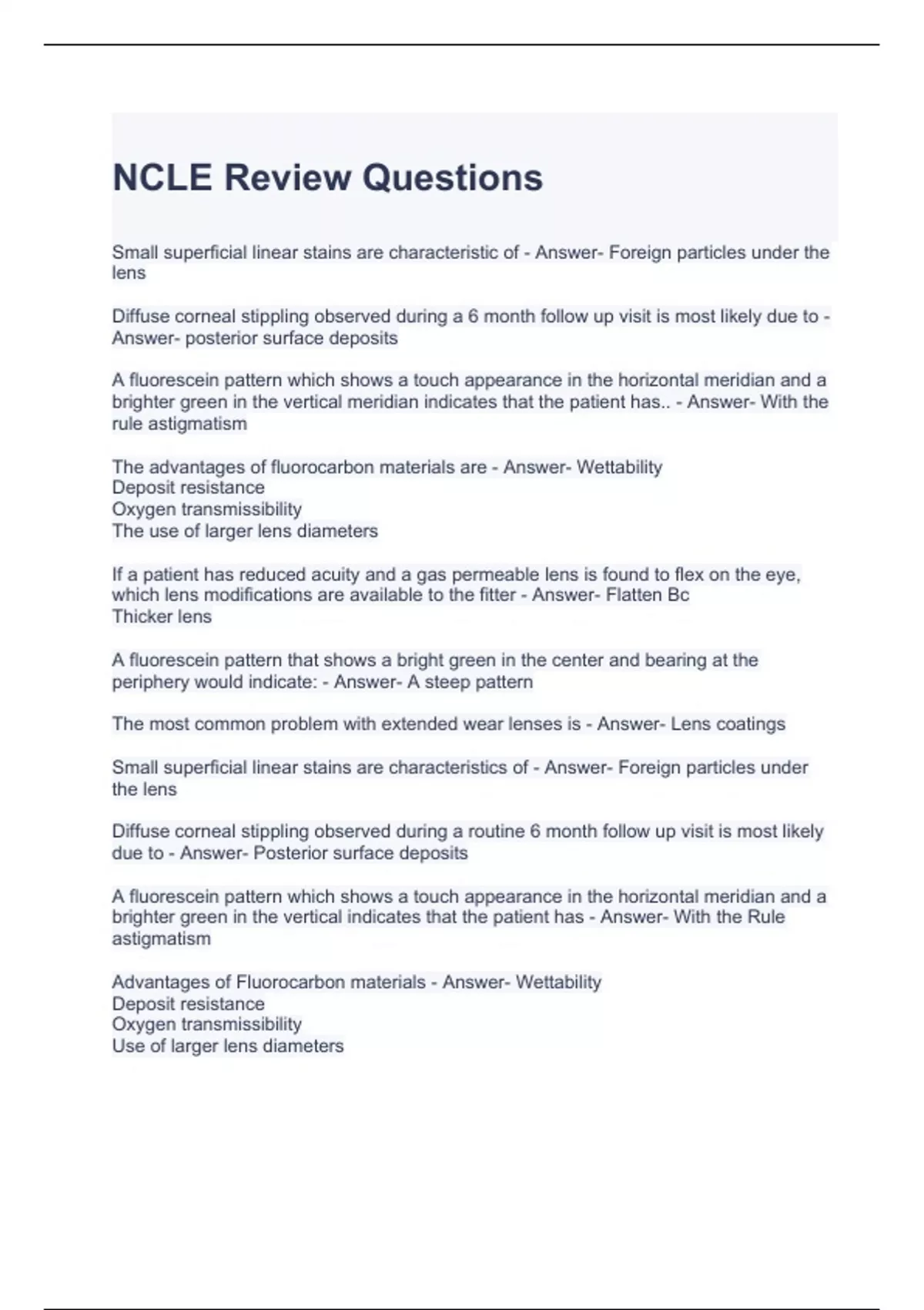 NCLE Review Questions with 100% correct Answers