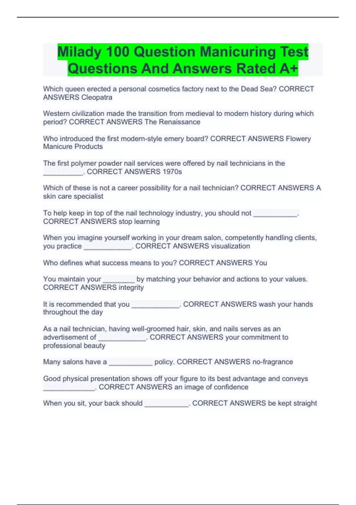 Milady 100 Question Manicuring Test Questions And Answers Rated A+