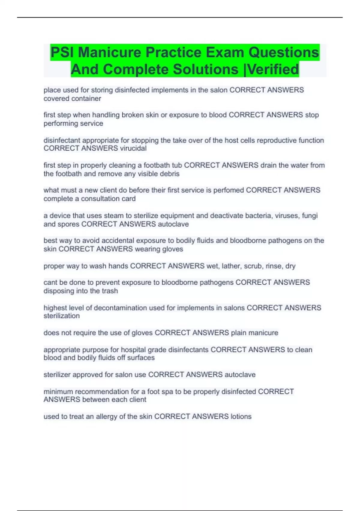 PSI Manicure Practice Exam Questions And Complete Solutions |Verified