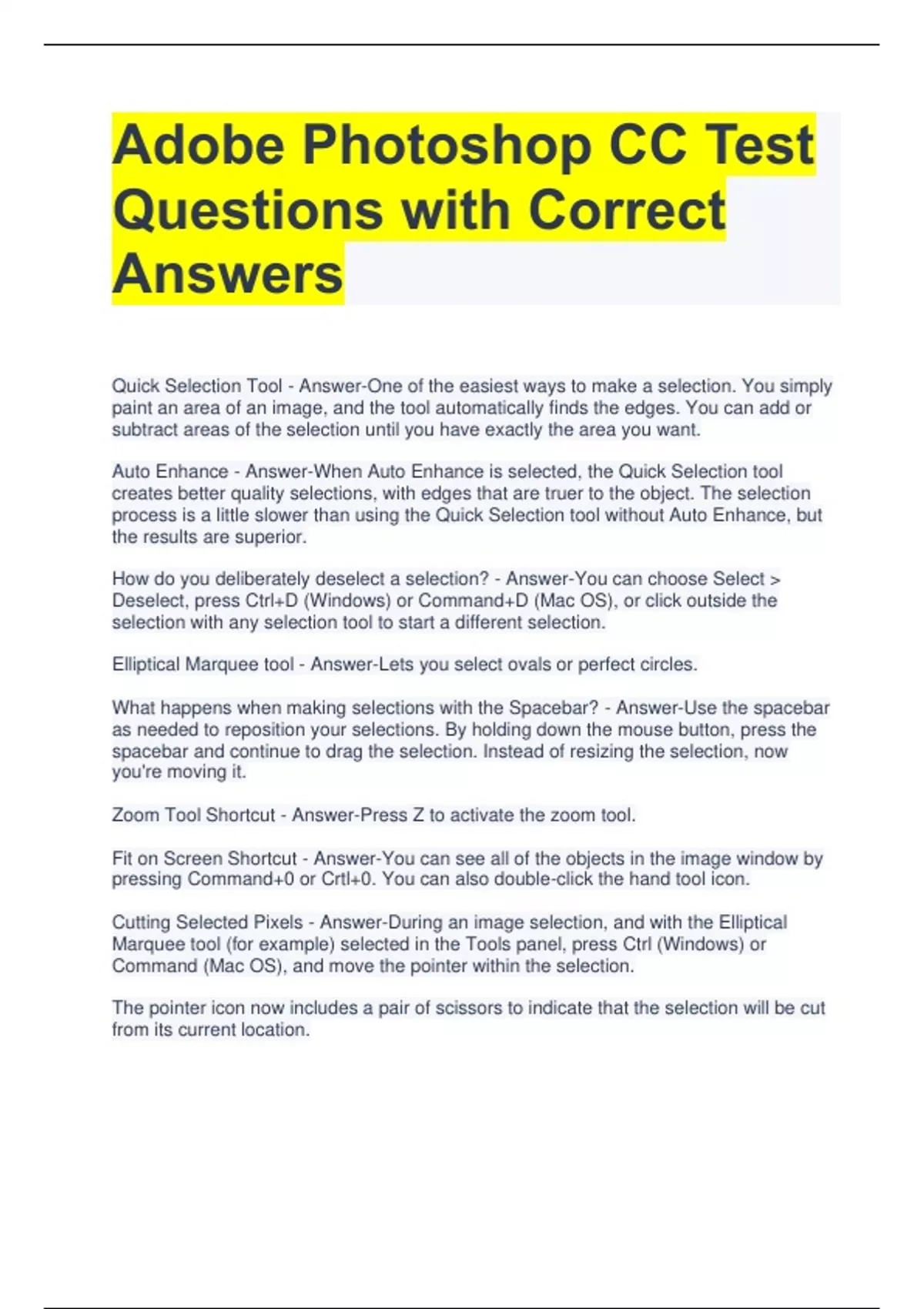 Adobe Photoshop CC Test Questions with Correct Answers Quick Selection Tool - Answer-One of the easiest ways to make a selection. You simply paint an area of an image, and the tool automatically finds the edges. You can add or subtract areas of the selection until you have exactly the area you want. Auto Enhance - Answer-When Auto Enhance is selected, the Quick Selection tool creates better quality selections, with edges that are truer to the object. The selection process is a little slower than using the Quick Selection tool without Auto Enhance, but the results are superior. How do you deliberately deselect a selection? - Answer-You can choose Select Deselect, press Ctrl+D (Windows) or Command+D (Mac OS), or click outside the selection with any selection tool to start a different selection. Elliptical Marquee tool - Answer-Lets you select ovals or perfect circles. What happens when making selections with the Spacebar? - Answer-Use the spacebar as needed to reposition your selections. By holding down the mouse button, press the spacebar and continue to drag the selection. Instead of resizing the selection, now you're moving it. Zoom Tool Shortcut - Answer-Press Z to activate the zoom tool. Fit on Screen Shortcut - Answer-You can see all of the objects in the image window by pressing Command+0 or Crtl+0. You can also double-click the hand tool icon. Cutting Selected Pixels - Answer-During an image selection, and with the Elliptical Marquee tool (for example) selected in the Tools panel, press Ctrl (Windows) or Command (Mac OS), and move the pointer within the selection. The pointer icon now includes a pair of scissors to indicate that the selection will be cut from its current location. What happens with a selection when using the arrow keys? - Answer-You can make minor adjustments to the position of selected pixels by using the arrow keys. You can nudge the selection in increments of either one pixel or ten pixels. When you hold down the Shift key, the selection moves ten pixels every time you press an arrow key. How to hide the edges of a selection temporarily? - Answer-You can hide the edges of a selection temporarily without actually deselecting, and then display the selection border once you've completed the adjustments. Choose View Show Selection Edges or View Extras. You can also press Command+H or Control+H Either command hides the selection border around the plate of shells.