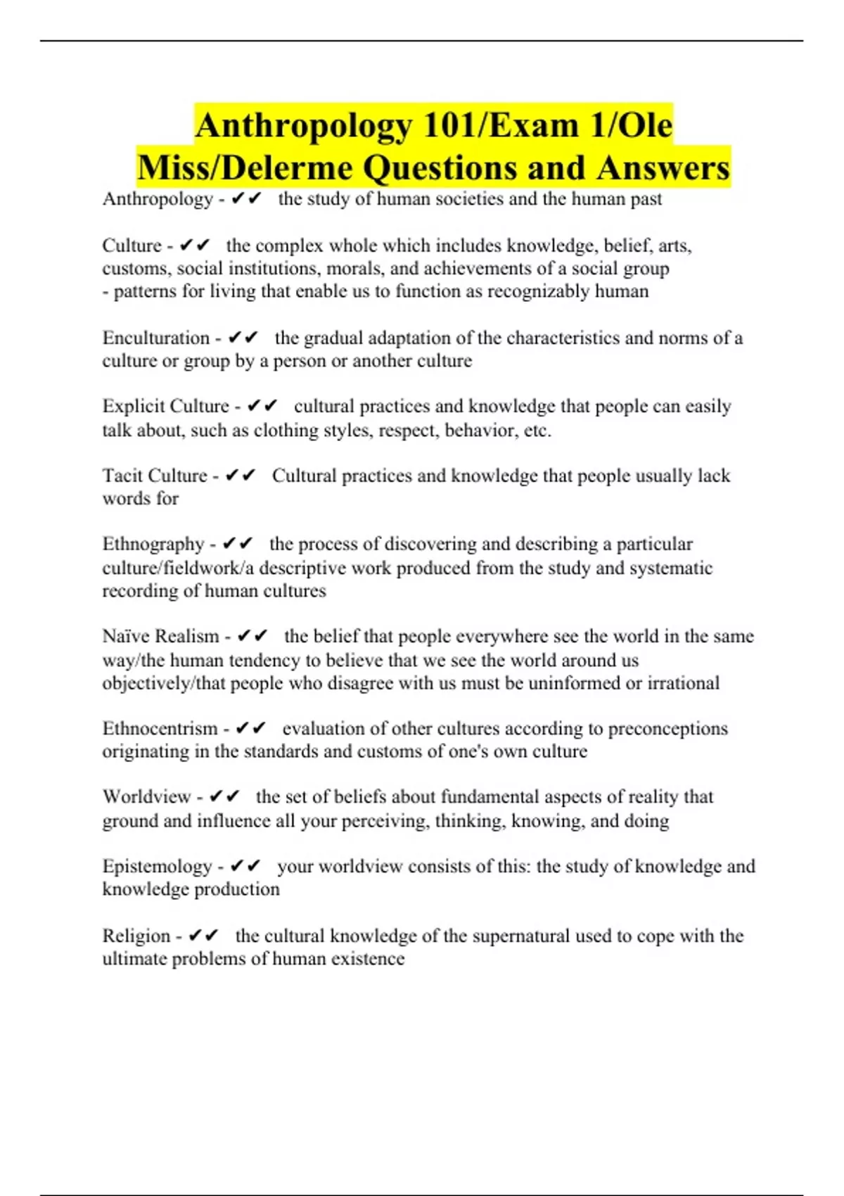 Anthropology 101/Exam 1/Ole Miss/Delerme Questions and Answers