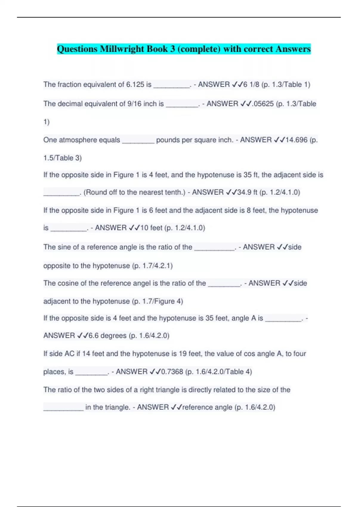 Questions Millwright Book 3 (complete) with correct Answers The fraction equivalent of 6.125 is _________. - ANSWER ️️ 6 1/8 (p. 1.3/Table 1) The decimal equivalent of 9/16 inch is ________. - ANSWER ️️ .05625 (p. 1.3/Table 1) One atmosphere equals ________ pounds per square inch. - ANSWER ️️ 14.696 (p. 1.5/Table 3) If the opposite side in Figure 1 is 4 feet, and the hypotenuse is 35 ft, the adjacent side is _________. (Round off to the nearest tenth.) - ANSWER ️️ 34.9 ft (p. 1.2/4.1.0) If the opposite side in Figure 1 is 6 feet and the adjacent side is 8 feet, the hypotenuse is _________. - ANSWER ️️ 10 feet (p. 1.2/4.1.0) The sine of a reference angle is the ratio of the __________. - ANSWER ️️ side opposite to the hypotenuse (p. 1.7/4.2.1) The cosine of the reference angel is the ratio of the ________. - ANSWER ️️ side adjacent to the hypotenuse (p. 1.7/Figure 4) If the opposite side is 4 feet and the hypotenuse is 35 feet, angle A is _________. - ANSWER ️️ 6.6 degrees (p. 1.6/4.2.0) If side AC if 14 feet and the hypotenuse is 19 feet, the value of cos angle A, to four places, is ________. - ANSWER ️️ 0.7368 (p. 1.6/4.2.0/Table 4) The ratio of the two sides of a right triangle is directly related to the size of the __________ in the triangle. - ANSWER ️️ reference angle (p. 1.6/4