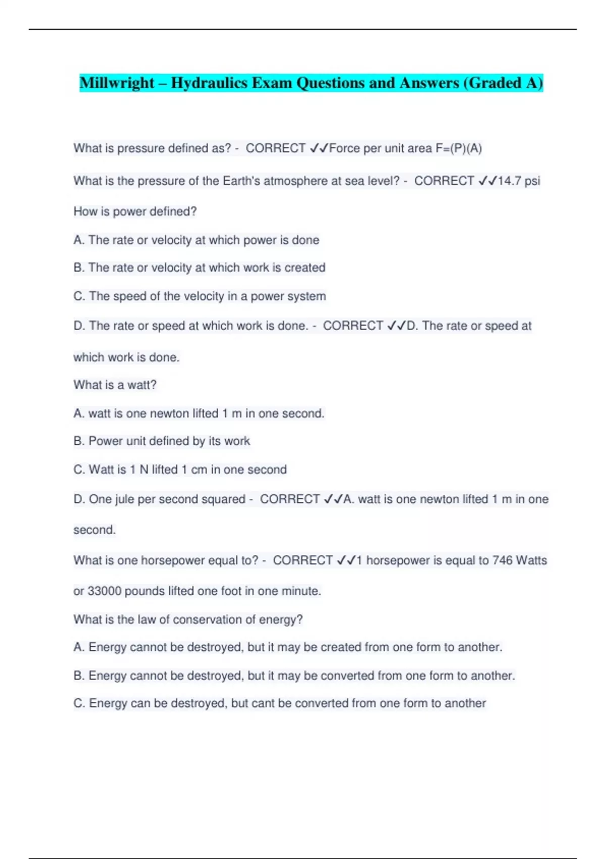 Millwright – Hydraulics Exam Questions and Answers (Graded A) What is pressure defined as? - CORRECT ️️ Force per unit area F=(P)(A) What is the pressure of the Earth's atmosphere at sea level? - CORRECT ️️ 14.7 psi How is power defined? A. The rate or velocity at which power is done B. The rate or velocity at which work is created C. The speed of the velocity in a power system D. The rate or speed at which work is done. - CORRECT ️️ D. The rate or speed at which work is done. What is a watt? A. watt is one newton lifted 1 m in one second. B. Power unit defined by its work C. Watt is 1 N lifted 1 cm in one second D. One jule per second squared - CORRECT ️️ A. watt is one newton lifted 1 m in one second. What is one horsepower equal to? - CORRECT ️️ 1 horsepower is equal to 746 Watts or 33000 pounds lifted one foot in one minute. What is the law of conservation of energy? A. Energy cannot be destroyed, but it may be created from one form to another. B. Energy cannot be destroyed, but it may be converted from one form to another. C. Energy can be destroyed, but cant be converted from one