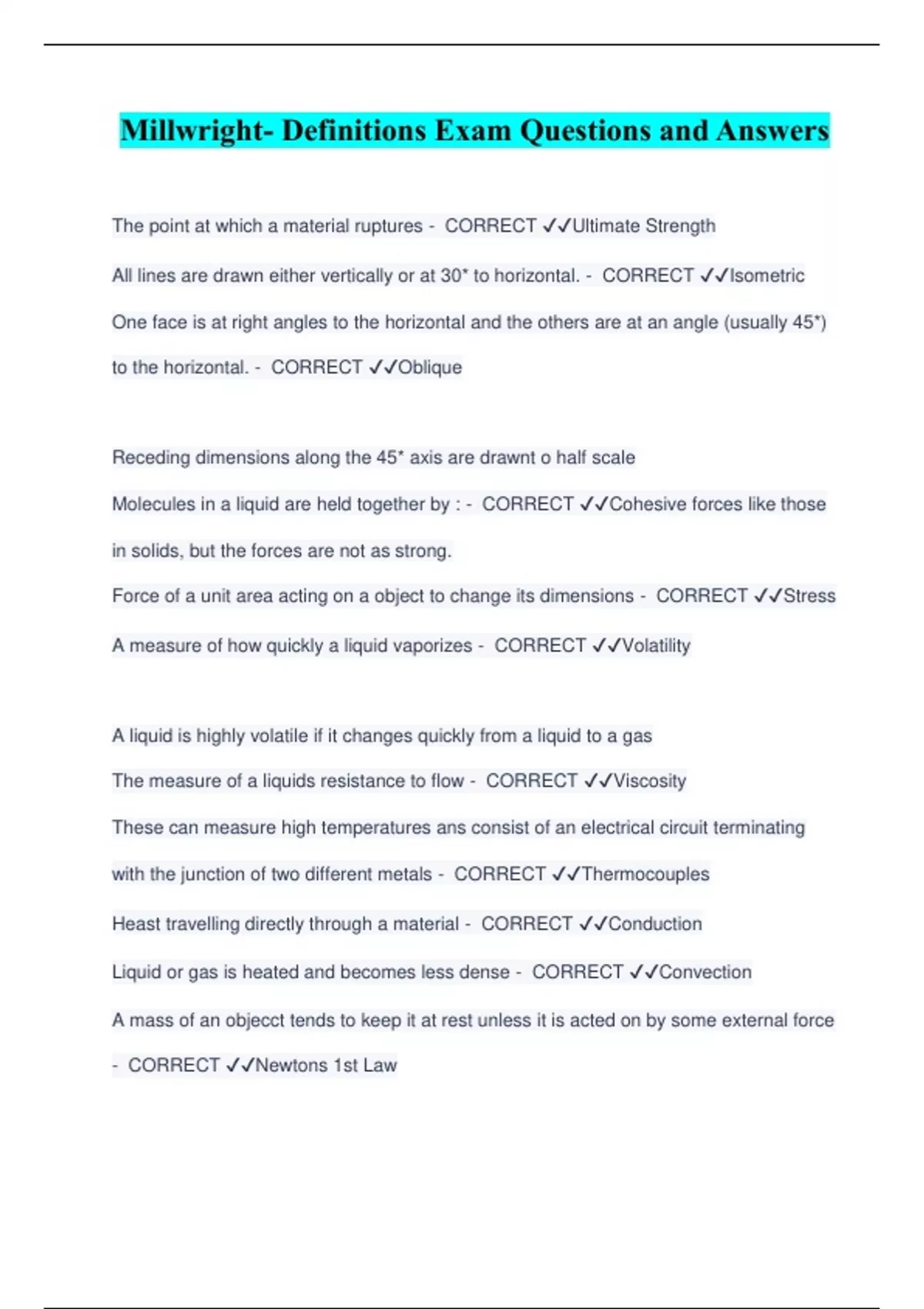 Millwright- Definitions Exam Questions and Answers The point at which a material ruptures - CORRECT ️️ Ultimate Strength All lines are drawn either vertically or at 30* to horizontal. - CORRECT ️️ Isometric One face is at right angles to the horizontal and the others are at an angle (usually 45*) to the horizontal. - CORRECT ️️ Oblique Receding dimensions along the 45* axis are drawnt o half scale Molecules in a liquid are held together by : - CORRECT ️️ Cohesive forces like those in solids, but the forces are not as strong. Force of a unit area acting on a object to change its dimensions - CORRECT ️️ Stress A measure of how quickly a liquid vaporizes - CORRECT ️️ Volatility A liquid is highly volatile if it changes quickly from a liquid to a gas The measure of a liquids resistance to flow - CORRECT ️️ Viscosity These can measure high temperatures ans consist of an electrical circuit terminating with the junction of two different metals - CORRECT ️️ Thermocouples Heast travelling directly through a material - CORRECT ️️ Conduction Liquid or gas is heated and becomes less dense - CORRECT ️️ Convection A mass of an objecct tends to keep it at rest unless it is acted on by some external force - CORRECT ️️ Newtons 1st Law