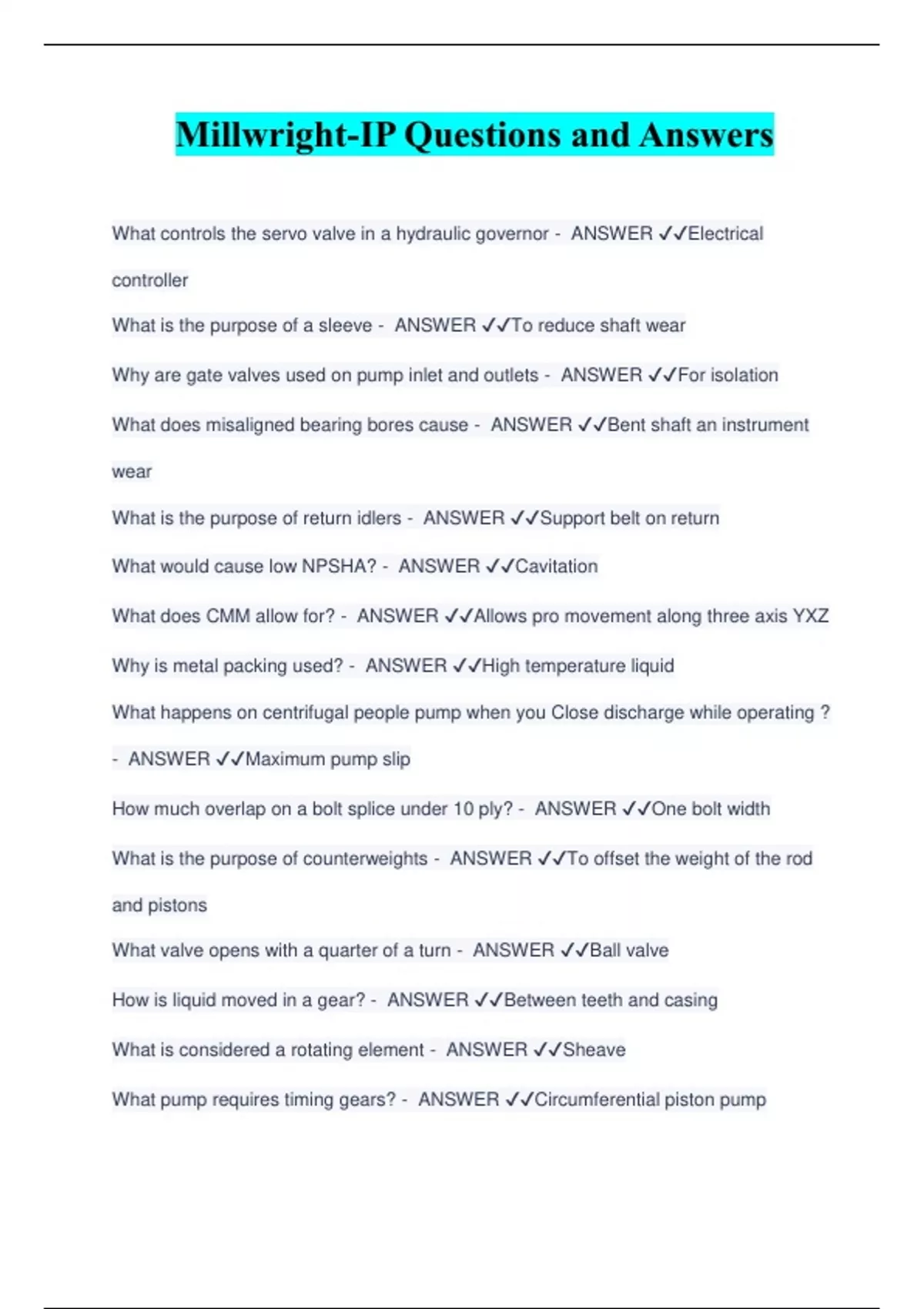 Millwright-IP Questions and Answers What controls the servo valve in a hydraulic governor - ANSWER ️️ Electrical controller What is the purpose of a sleeve - ANSWER ️️ To reduce shaft wear Why are gate valves used on pump inlet and outlets - ANSWER ️️ For isolation What does misaligned bearing bores cause - ANSWER ️️ Bent shaft an instrument wear What is the purpose of return idlers - ANSWER ️️ Support belt on return What would cause low NPSHA? - ANSWER ️️ Cavitation What does CMM allow for? - ANSWER ️️ Allows pro movement along three axis YXZ Why is metal packing used? - ANSWER ️️ High temperature liquid What happens on centrifugal people pump when you Close discharge while operating ? - ANSWER ️️ Maximum pump slip How much overlap on a bolt splice under 10 ply? - ANSWER ️️ One bolt width What is the purpose of counterweights - ANSWER ️️ To offset the weight of the rod and pistons What valve opens with a quarter of a turn - ANSWER ️️ Ball valve How is liquid moved in a gear? - ANSWER ️️ Between teeth and casing What is considered a rotating element - ANSWER ️️ Sheave What pump requires timing gears? - ANSWER ️️ Circumferential pi