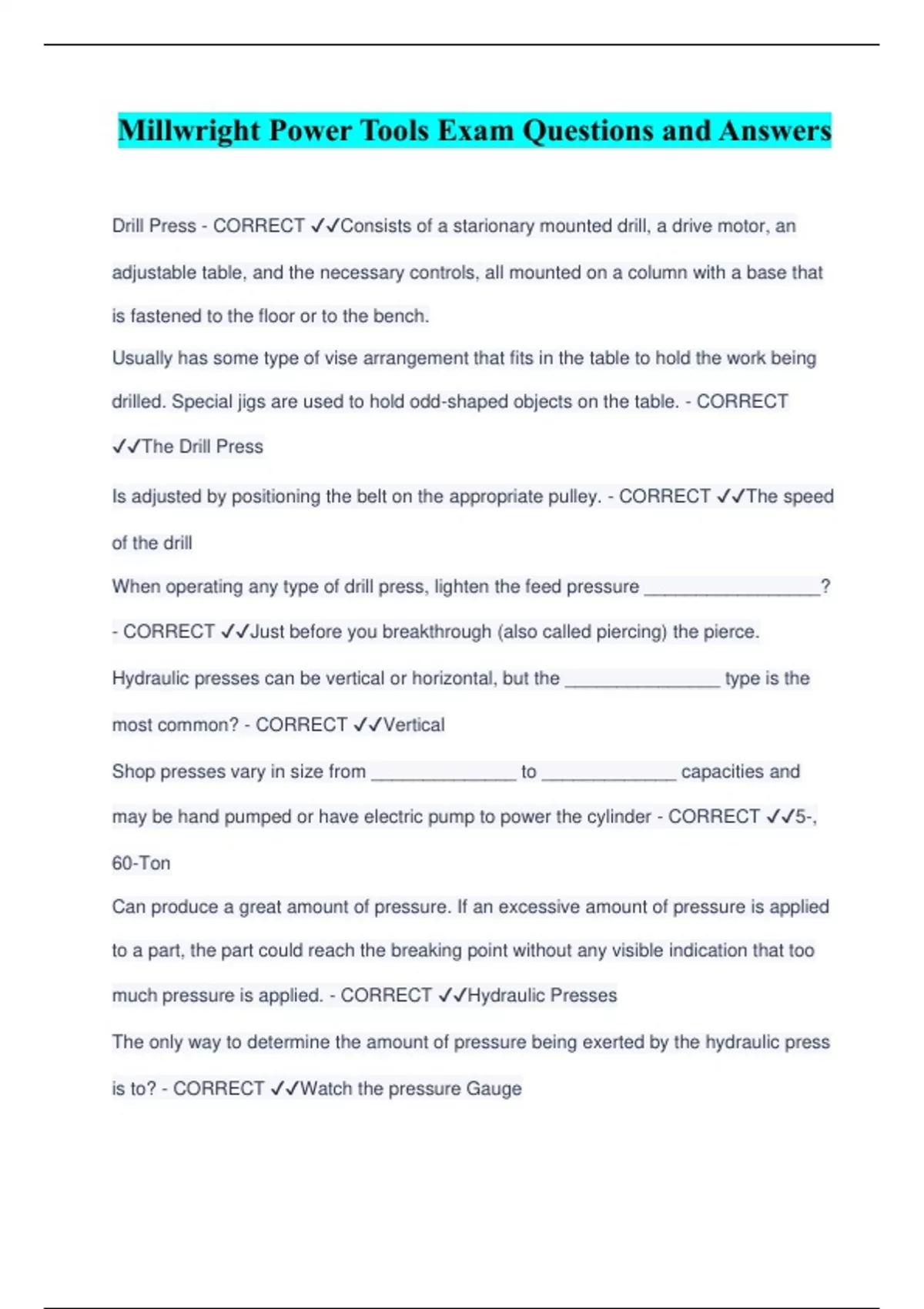 Millwright Power Tools Exam Questions and Answers Drill Press - CORRECT ️️ Consists of a starionary mounted drill, a drive motor, an adjustable table, and the necessary controls, all mounted on a column with a base that is fastened to the floor or to the bench. Usually has some type of vise arrangement that fits in the table to hold the work being drilled. Special jigs are used to hold odd-shaped objects on the table. - CORRECT ️️ The Drill Press Is adjusted by positioning the belt on the appropriate pulley. - CORRECT ️️ The speed of the drill When operating any type of drill press, lighten the feed pressure _________________? - CORRECT ️️ Just before you breakthrough (also called piercing) the pierce. Hydraulic presses can be vertical or horizontal, but the _______________ type is the most common? - CORRECT ️️ Vertical Shop presses vary in size from ______________ to _____________ capacities and may be hand pumped or have electric pump to power the cylinde