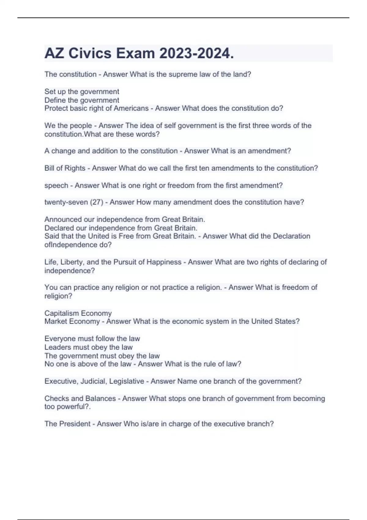 AZ Civics Exam . The constitution - Answer What is the supreme law of the land? Set up the government Define the government Protect basic right of Americans - Answer What does the constitution do? We the people - Answer The idea of self government is the first three words of the constitution.What are these words? A change and addition to the constitution - Answer What is an amendment? Bill of Rights - Answer What do we call the first ten amendments to the constitution? speech - Answer What is one right or freedom from the first amendment? twenty-seven (27) - Answer How many amendment does the constitution have? Announced our independence from Great Britain. Declared our independence from Great Britain. Said that the United is Free from Great Britain. - Answer What did the Declaration ofIndependence do? Life, Liberty, and the Pursuit of Happiness - Answer What are two rights of declaring of independence? You can practice any religion or not practice a religion. - Answer What is freedom of religion? Capitalism Economy Market Economy - Answer What is the economic system in the United States? Everyone must follow the law Leaders must obey the law The government must obey the law No one is above of the law - Answer What is the rule of law? Executive, Judicial, Legislative - Answer Name one branch of the government? Checks and Balances - Answer What stops one branch of government from becoming too powerful?. The President - Answer Who is/are in charge of the executive branch?