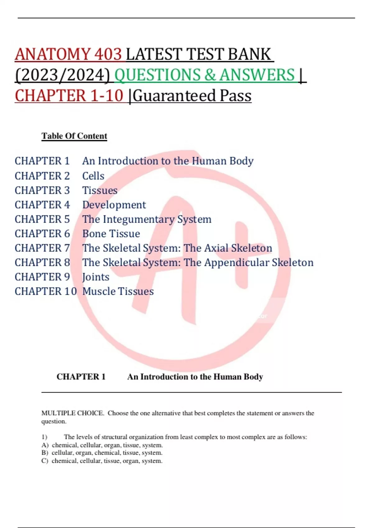 ANATOMY 403 LATEST TEST BANK (2023/2024) QUESTIONS & ANSWERS | CHAPTER 1-10 |Guaranteed Pass CHAPTER 1 An Introduction to the Human Body CHAPTER 2 Cells CHAPTER 3 Tissues CHAPTER 4 Development CHAPTER 5 The Integumentary System CHAPTER 6 Bone Tissue CHAPTER 7 The Skeletal System: The Axial Skeleton CHAPTER 8 The Skeletal System: The Appendicular Skeleton CHAPTER 9 Joints CHAPTER 10 Muscle Tissues