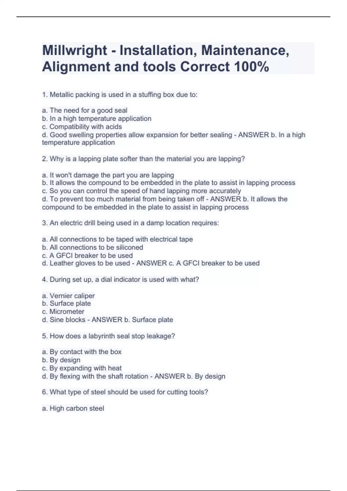 1. Metallic packing is used in a stuffing box due to: a. The need for a good seal b. In a high temperature application c. Compatibility with acids d. Good swelling properties allow expansion for better sealing - ANSWER b. In a high temperature application 2. Why is a lapping plate softer than the material you are lapping? a. It won't damage the part you are lapping b. It allows the compound to be embedded in the plate to assist in lapping process c. So you can control the speed of hand lapping more accurately d. To prevent too much material from being taken off - ANSWER b. It allows the compound to be embedded in the plate to assist in lapping process 3. An electric drill being used in a damp location requires: a. All connections to be taped with electrical tape b. All connections to be siliconed c. A GFCI breaker to be used d. Leather gloves to be used - ANSWER c. A GFCI breaker to be used 4. During set up, a dial indicator is used with what? a. Vernier caliper b. Surface plate c. Micrometer d. Sine blocks - ANSWER b. Surface plate 5. How does a labyrinth seal stop leakage? a. By contact with the box b. By design c. By expanding with heat d. By flexing with the shaft rotation - ANSWER b. By design 6. What type of steel should be used for cutting tools? a. High carbon steel b. Low carbon steel c. Tool steel d. Mild steel - ANSWER c. Tool steel 7. You need to shim a pump. You determine that it requires a 1/64", 1/8" 3/64" 5/32" and ½" shim. What is the total shim thickness? a. 27/32" b. 5/8" c. ¾" d. 29/64" - ANSWER a. 27/32" (1+8+3+10+32)/64"