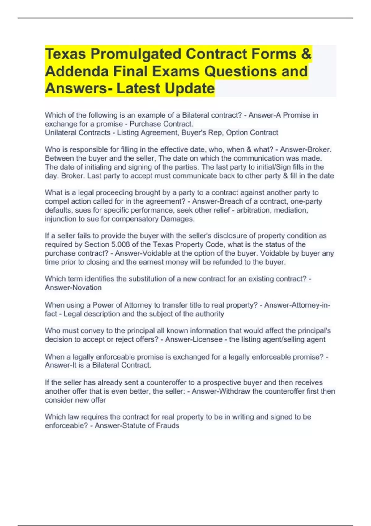 Texas Promulgated Contract Forms & Addenda Final Exams Questions and Answers- Latest Update