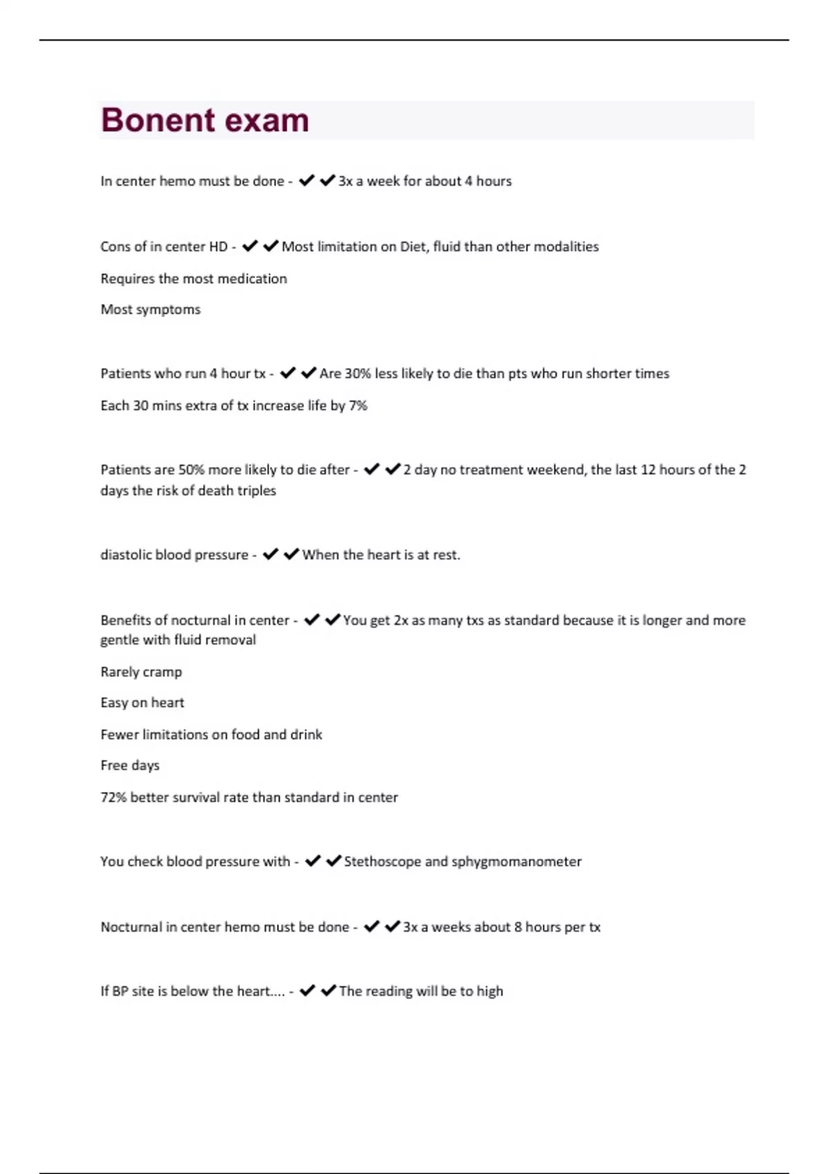 In center hemo must be done - 3x a week for about 4 hours Cons of in center HD - Most limitation on Diet, fluid than other modalities Requires the most medication Most symptoms Patients who run 4 hour tx - Are 30% less likely to die than pts who run shorter times Each 30 mins extra of tx increase life by 7% Patients are 50% more likely to die after - 2 day no treatment weekend, the last 12 hours of the 2 days the risk of death triples diastolic blood pressure - When the heart is at rest. Benefits of nocturnal in center - You get 2x as many txs as standard because it is longer and more gentle with fluid removal Rarely cramp Easy on heart Fewer limitations on food and drink Free days 72% better survival rate than standard in center You check blood pressure with - Stethoscope and sphygmomanometer Nocturnal in center hemo must be done - 3x a weeks about 8 hours per tx If BP site is below the heart.... - The reading will be to highBenefits of nocturnal home hemo - Better protein level Don't need binders No fluid limits Fewer symptoms Less heart damage Live as long as people who get a deceased kidney transplant If BP site is above the heart.... - The reading will be to low Home hemo must be done - 3x a week 4-6 hours per tx