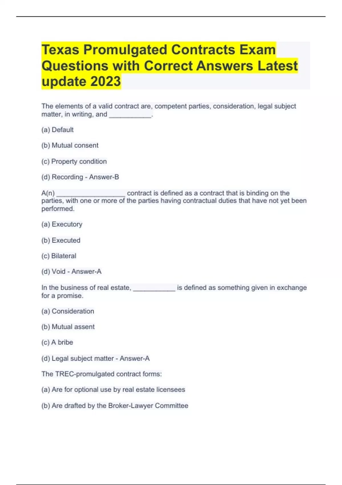 Texas Promulgated Contracts Exam Questions with Correct Answers Latest update 2023