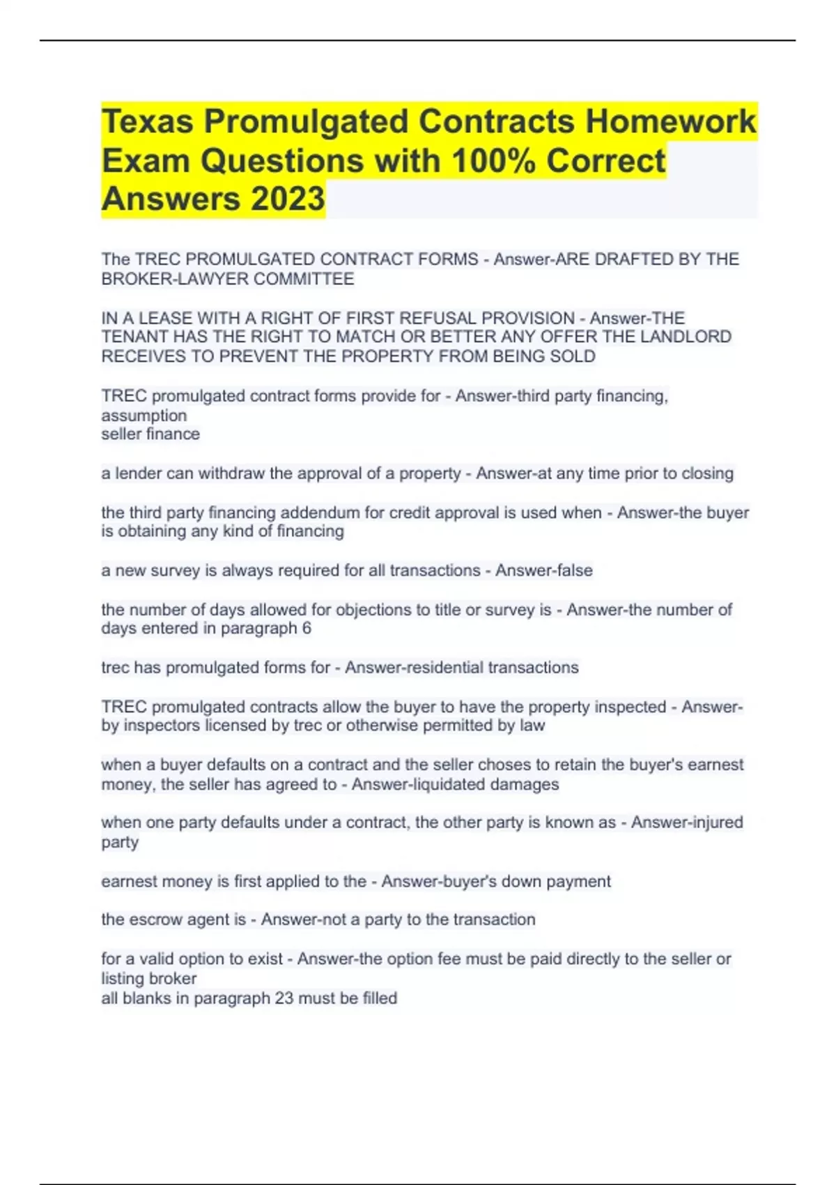 Texas Promulgated Contracts Homework Exam Questions with 100% Correct Answers 2023