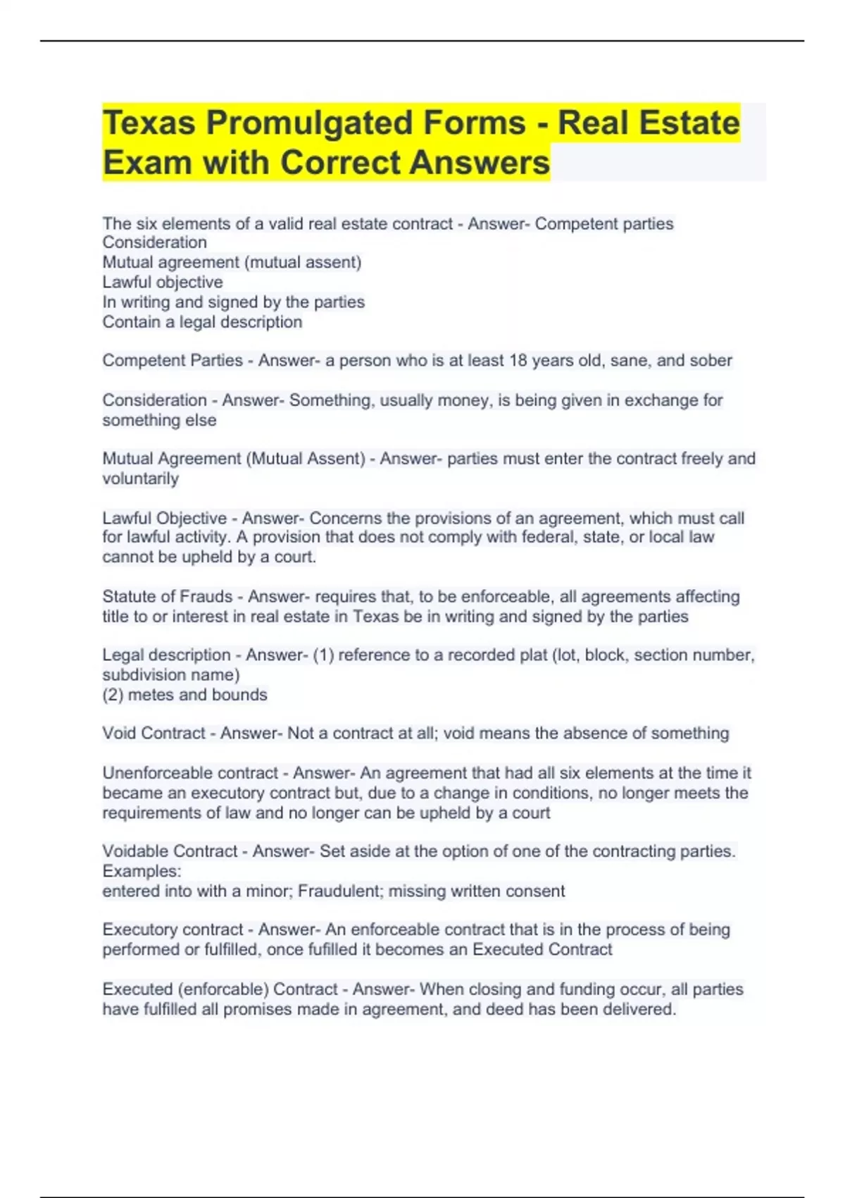 The six elements of a valid real estate contract - Answer- Competent parties