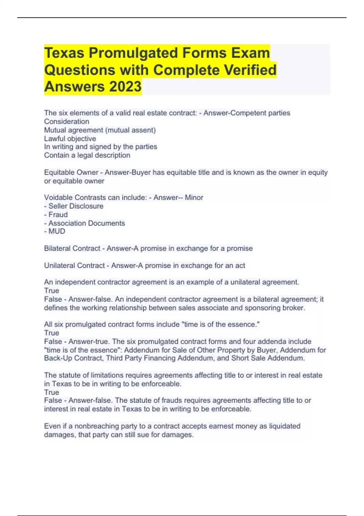 Texas Promulgated Forms Exam Questions with Complete Verified Answers 2023