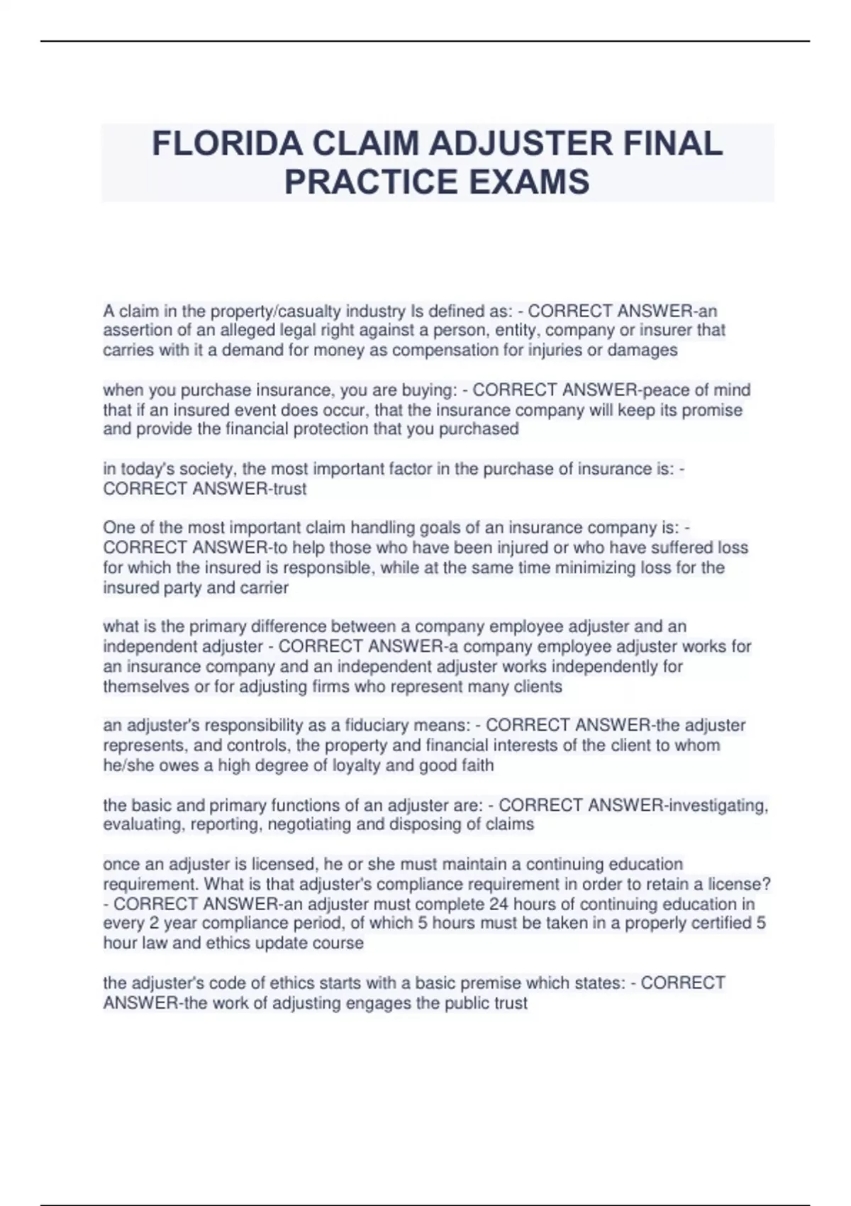 FLORIDA CLAIM ADJUSTER FINAL PRACTICE EXAMS A claim in the property/casualty industry Is defined as: - CORRECT ANSWER-an assertion of an alleged legal right against a person, entity, company or insurer that carries with it a demand for money as compensation for injuries or damages when you purchase insurance, you are buying: - CORRECT ANSWER-peace of mind that if an insured event does occur, that the insurance company will keep its promise and provide the financial protection that you purchased in today's society, the most important factor in the purchase of insurance is: - CORRECT ANSWER-trust One of the most important claim handling goals of an insurance company is: - CORRECT ANSWER-to help those who have been injured or who have suffered loss for which the insured is responsible, while at the same time minimizing loss for the insured party and carrier what is the primary difference between a company employee adjuster and an independent adjuster - CORRECT ANSWER-a company employee adjuster works for an insurance company and an independent adjuster works independently for themselves or for adjusting firms who represent many clients an adjuster's responsibility as a fiduciary means: - CORRECT ANSWER-the adjuster represents, and controls, the property and financial interests of the client to whom he/she owes a high degree of loyalty and good faith the basic and primary functions of an adjuster are: - CORRECT ANSWER-investigating, evaluating, reporting, negotiating and disposing of claims once an adjuster is licensed, he or she must maintain a continuing education requirement. What is that adjuster's compliance requirement in order to retain a license? - CORRECT ANSWER-an adjuster must complete 24 hours of continuing education in every 2 year compliance period, of which 5 hours must be taken in a properly certified 5 hour law and ethics update course the adjuster's code of ethics starts with a basic premise which states: - CORRECT ANSWER-the work of adjusting engages the public trust Which of the following would NOT be a preferred claims practice or behavior under FL Unfair Insurance Trade Practices Act? - CORRECT ANSWER-Not responding to an insured calls because you haven't made up your mind what are the four critical elements of a contract? - CORRECT ANSWER-1. agreement to terms (must understand what is given and received) 2. adequate consideration for the promises made 3. legal capacity of the parties to contract 4. contract must have legal purpose an insurance policy is often referred to as a contract of adhesion which means: - CORRECT ANSWER-if any of the wording or language in the policy is vague or ambiguous, making it difficult to understand or interpret, the law is well settled that the interpretation shall be in favor of the party who did not control its terms (the policyholder) breach of contract by a carrier or its adjuster through non-payment or on-compliance with policy requirements, could have the following consequences for a carrier - CORRECT ANSWER-if found guilty of a breach of contract, the carrier could be punished with a "bad faith" verdict that would cost it millions of dollars what are the fundamental parts of an insurance policy? - CORRECT ANSWER-1. Declarations Page 2. Insuring Agreement 3. Exclusions 4. Conditions What is one of the duties of an insured following a loss? - CORRECT ANSWER-giving prompt notice of loss to the insurer describe the difference between a peril and a hazard - CORRECT ANSWER-a peril is a cause of loss, like fire. A hazard is a condition that exists beforehand that increases the likelihood of such a loss, like a messy storeroom or garage the doctrine of proximate cause is defined as - CORRECT ANSWER-if there is an unbroken chain of events, or series of consequences, flowing from the initial loss caused by the insured peril to a subsequent loss, the insured peril causing the initial loss will be considered the "proximate cause" of the subsequent loss A couple had Coverage A limits of $250K on their home located in FL. A tornado spawned by Hurricane Ernesto damaged their roof resulting in estimated repair costs of $11,500. The adjuster deducted the FL hurricane deductible of $5,000 from the estimate and paid them $6,500 in settlement of their property claim. This is known as the application of: - CORRECT ANSWER-a percentage deductible (hurricane deductible)