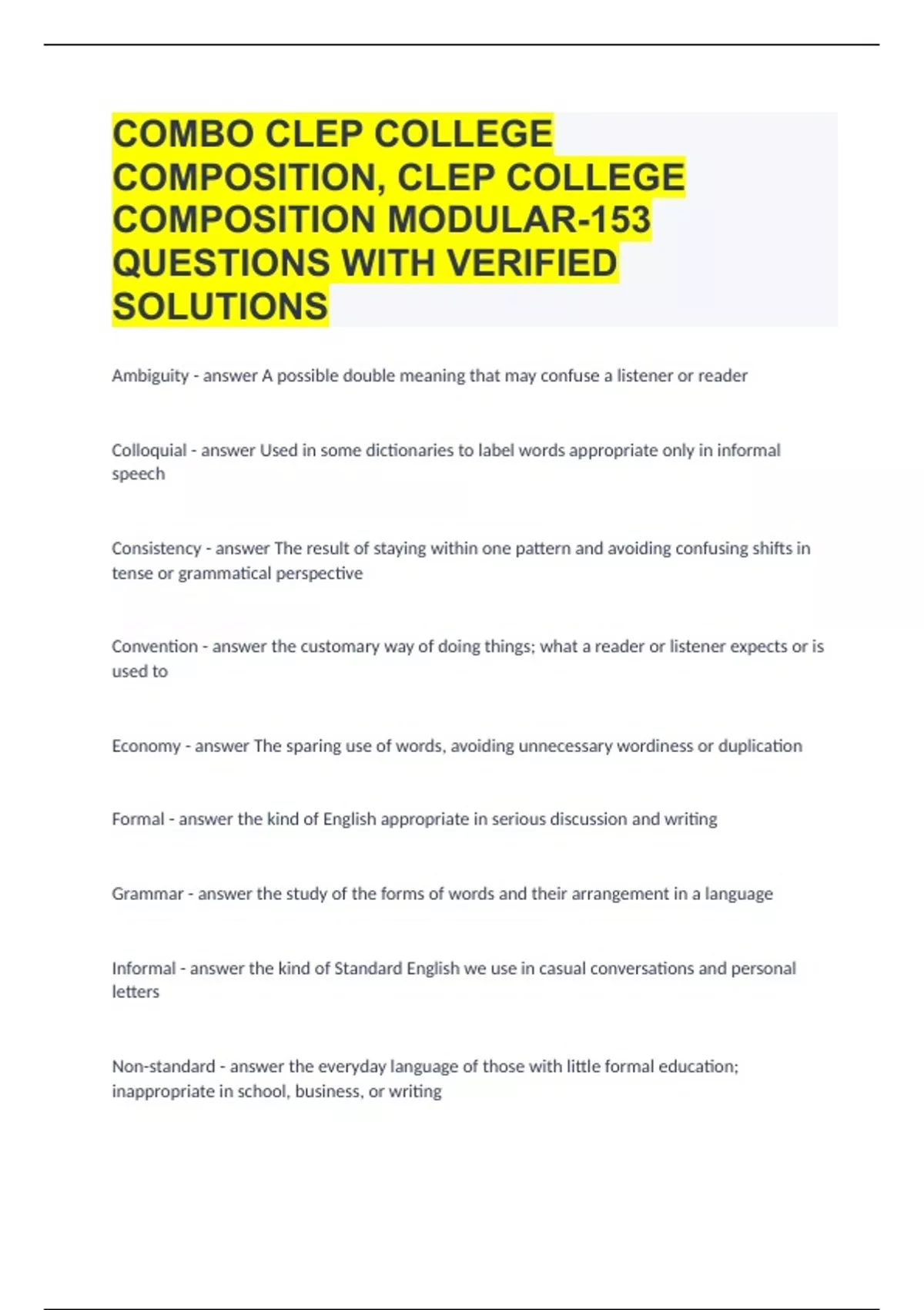COMBO CLEP COLLEGE COMPOSITION, CLEP COLLEGE COMPOSITION MODULAR-153 QUESTIONS AND ANSWERS