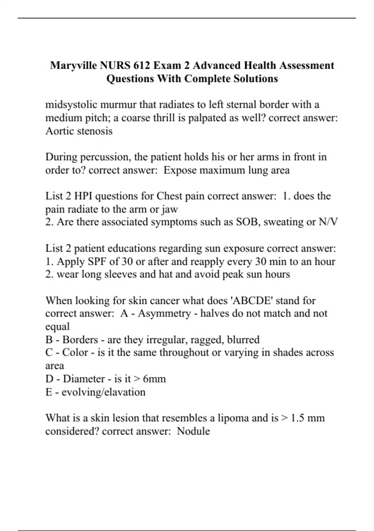 Maryville NURS 612 Exam 2 Advanced Health Assessment Questions With Complete Solutions