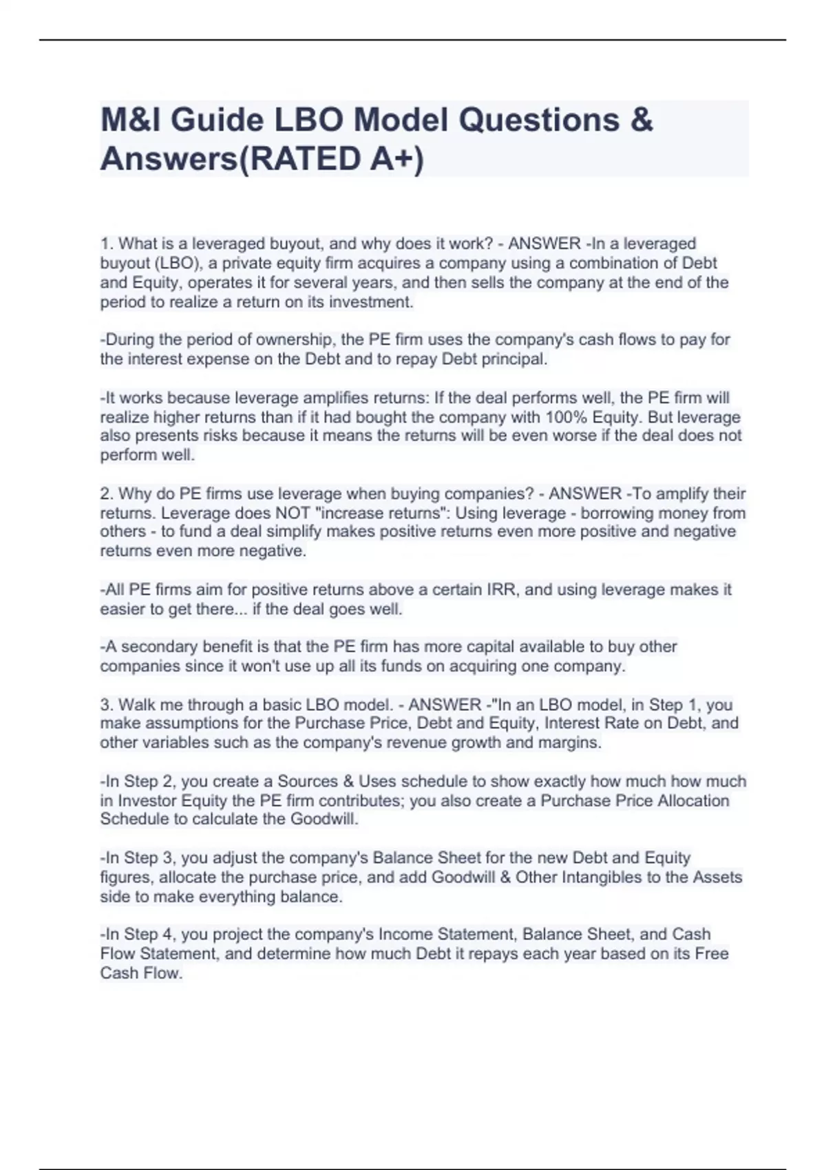 M&I Guide LBO Model Questions & Answers(RATED A+)
