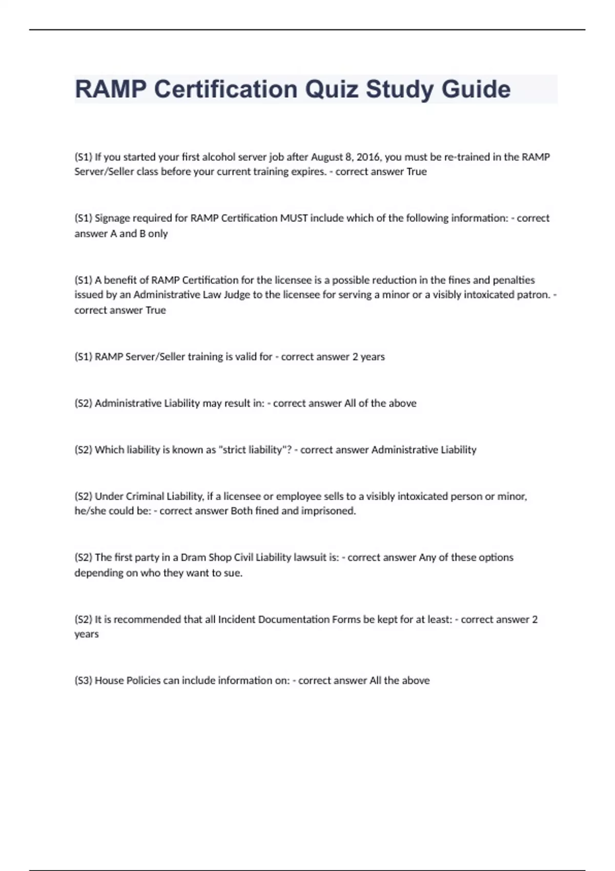 RAMP Certification Quiz Study Guide Question and answers 100% correct 2023/2024 (S1) If you started your first alcohol server job after August 8, 2016, you must be re-trained in the RAMP Server/Seller class before your current training expires. - correct answer True (S1) Signage required for RAMP Certification MUST include which of the following information: - correct answer A and B only (S1) A benefit of RAMP Certification for the licensee is a possible reduction in the fines and penalties issued by an Administrative Law Judge to the licensee for serving a minor or a visibly intoxicated patron. - correct answer True (S1) RAMP Server/Seller training is valid for - correct answer 2 years (S2) Administra