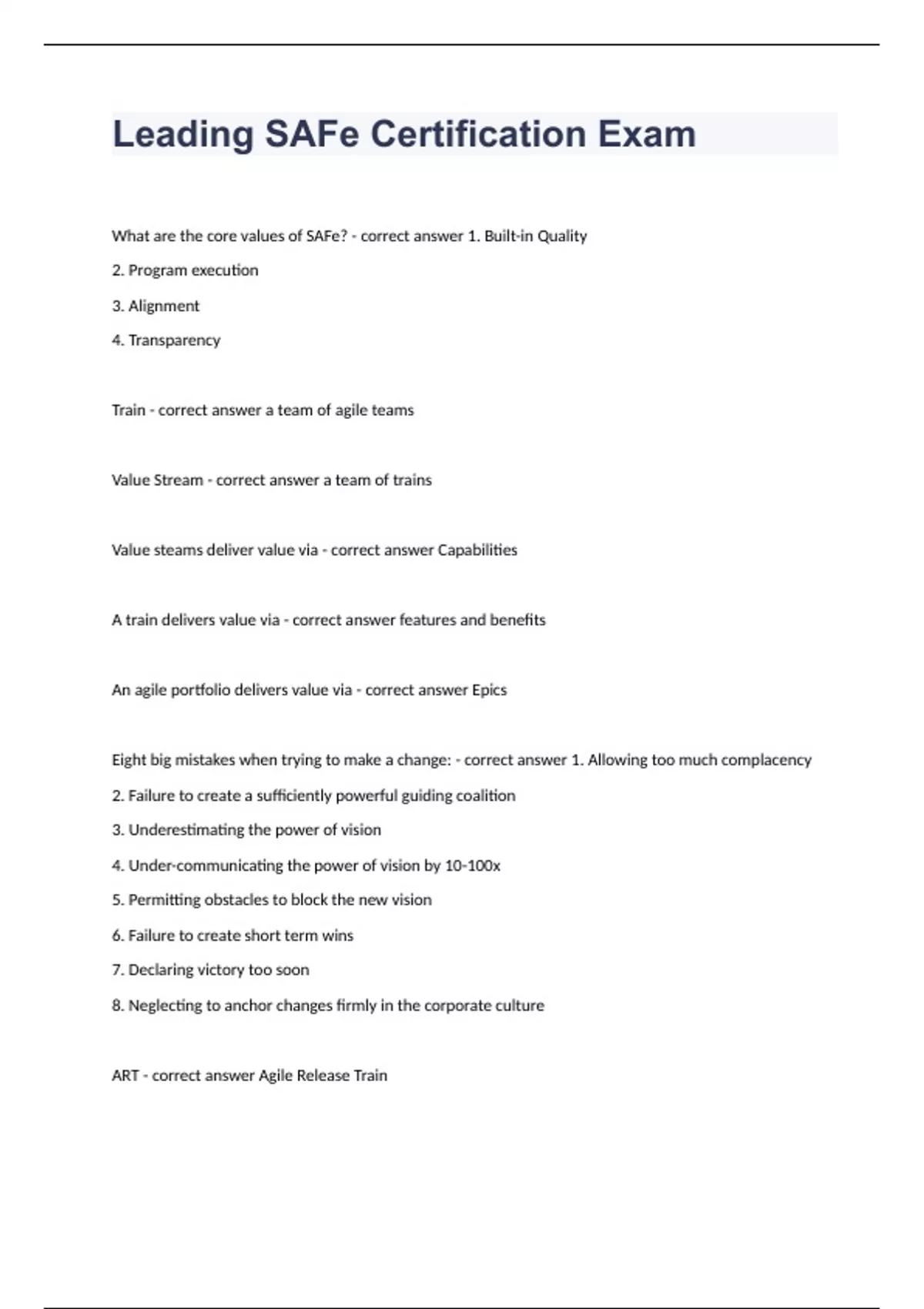 Leading SAFe Certification Exam Questions with complete solution 2023/2024 What are the core values of SAFe? - correct answer 1. Built-in Quality 2. Program execution 3. Alignment 4. Transparency Train - correct answer a team of agile teams Value Stream - correct answer a team of trains Value steams deliver value via - correct answer Capabilities A train delivers value via - correct answer features and benefits An agile portfolio delivers value via - correct answer Epics