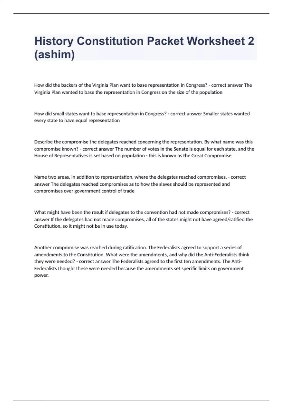 History Constitution Packet Worksheet 2 (ashim) Question and answers already passed 2023/2024How did the backers of the Virginia Plan want to base representation in Congress? - correct answer The Virginia Plan wanted to base the representation in Congress on the size of the population How did small states want to base representation in Congress? - correct answer Smaller states wanted every state to have equal representation Describe the compromise the delegates reached concerning the representation. By what name was this compromise known? - correct answer The number of votes in the Senate is equal for each state, and the House of Representatives is set based on population - this is known as the Great Compromise Name two areas, in addition to representation, where the delegates reached compromises. - correct answer The delegates reached compromises as to how the slaves should be represented and compromises over government control of trade