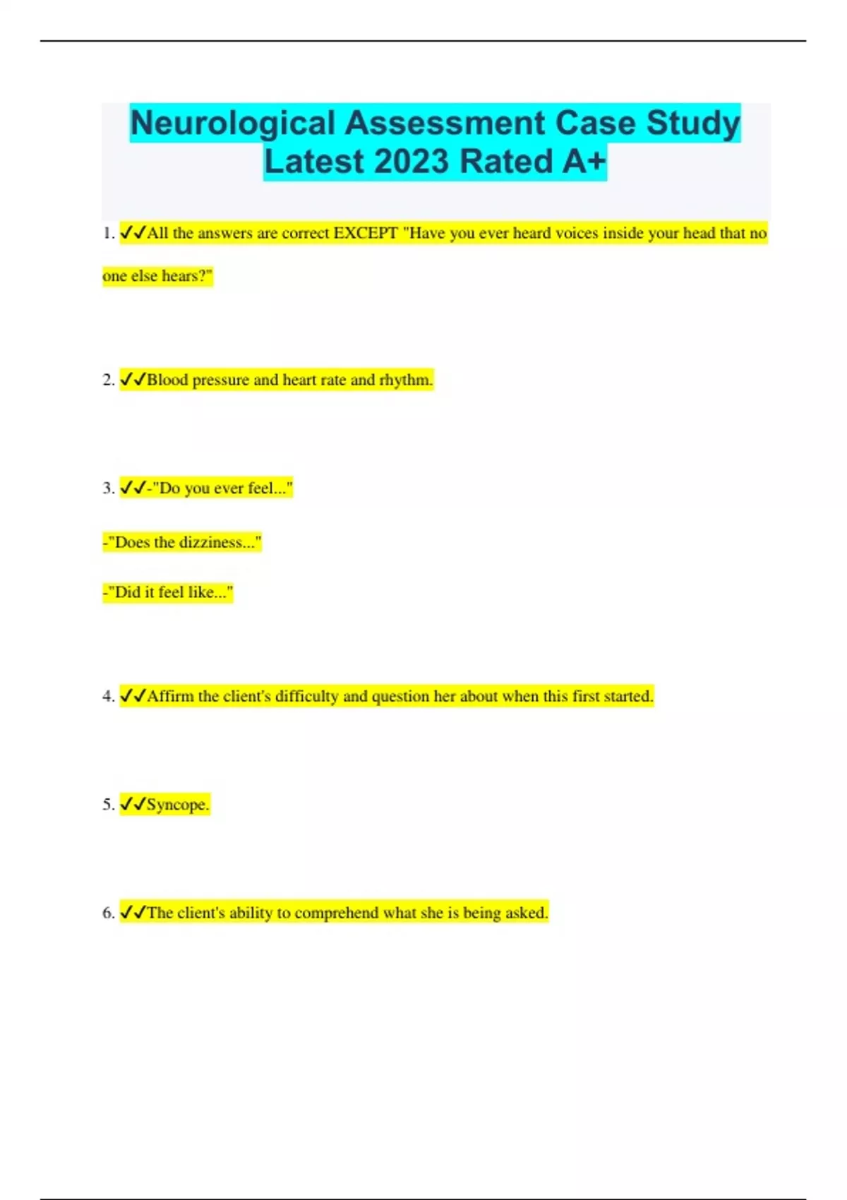 Neurological Assessment Case Study Latest 2023 Rated A+ 1. All the answers are correct EXCEPT "Have you ever heard voices inside your head that no one else hears?" 2. Blood pressure and heart rate and rhythm. 3. -"Do you ever feel..." -"Does the dizziness..." -"Did it feel like..." 4. Affirm the client's difficulty and question her about when this first started. 5. Syncope. 6. The client's ability to comprehend what she is being asked. 7. Oriented to situation. 8. Question her about how she arrived at the hospital today. 9. The client indicated the need to notify her daughter that she is in the hospital. 10. -Oculomotor. -Trochlear. -Abducens. 11. Hold a penlight to the side of one eye. 12. Observe for symmetric facial movement. 13. Apply resistance to the client's shoulders. 14. Ask the client to touch her thumb to each finger. 15. Squeeze my fingers with both hands at the same time. 16. Perform a palmar drift test. 17. Vibration 18. Place a comb in the client's left hand and ask her to identify the object. 19. Strike the thumb with the reflex hammer. 20. Explain to the client that the reflex response was normal. 21. Call the client's name. 22. -Verbal response. -Eye opening response. -Motor response. 23. The client's designated power of attorney for health care. 24. Organ donor status.