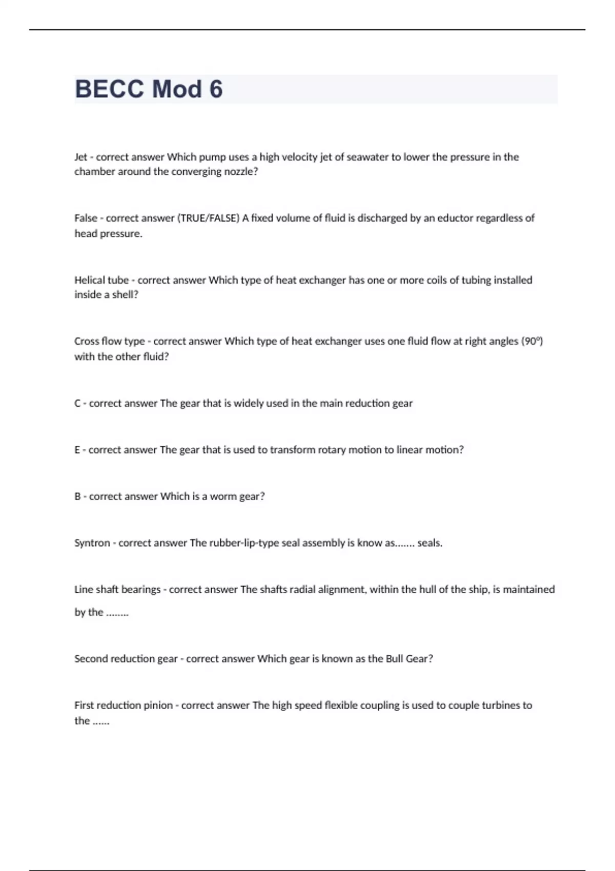 BECC Mod 6 Question and answers already passed 2023/2024Jet - correct answer Which pump uses a high velocity jet of seawater to lower the pressure in the chamber around the converging nozzle? False - correct answer (TRUE/FALSE) A fixed volume of fluid is discharged by an eductor regardless of head pressure. Helical tube - correct answer Which type of heat exchanger has one or more coils of tubing installed inside a shell? Cross flow type - correct answer Which type of heat exchanger uses one fluid flow at right angles (90°) with the other fluid? C - correct answer The gear that is widely used in the main reduction gear